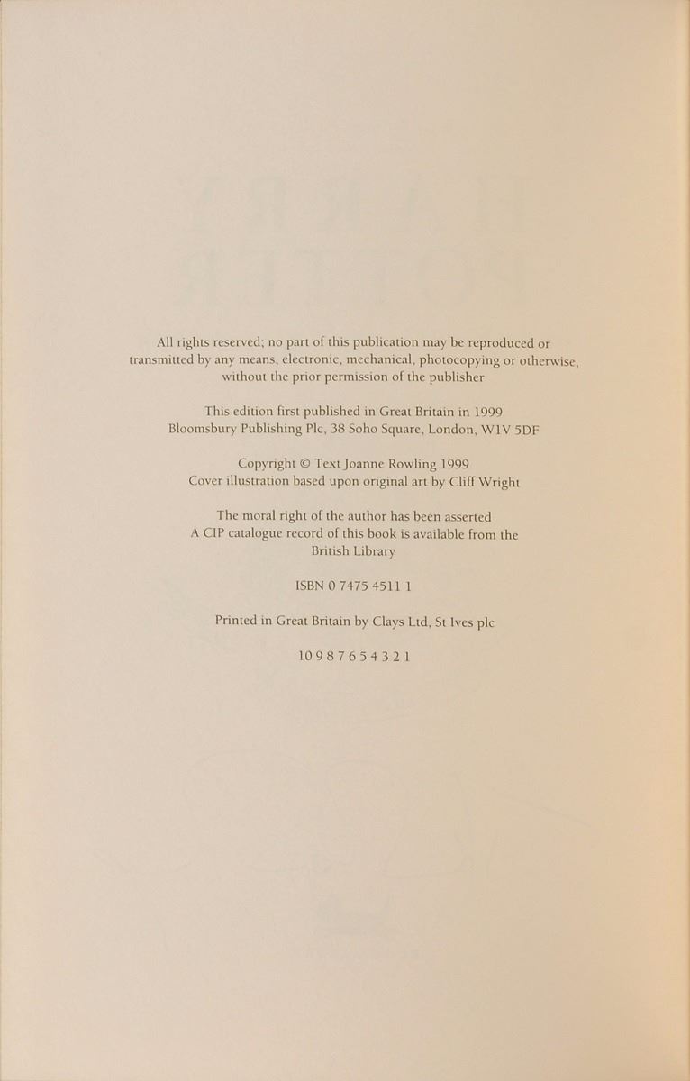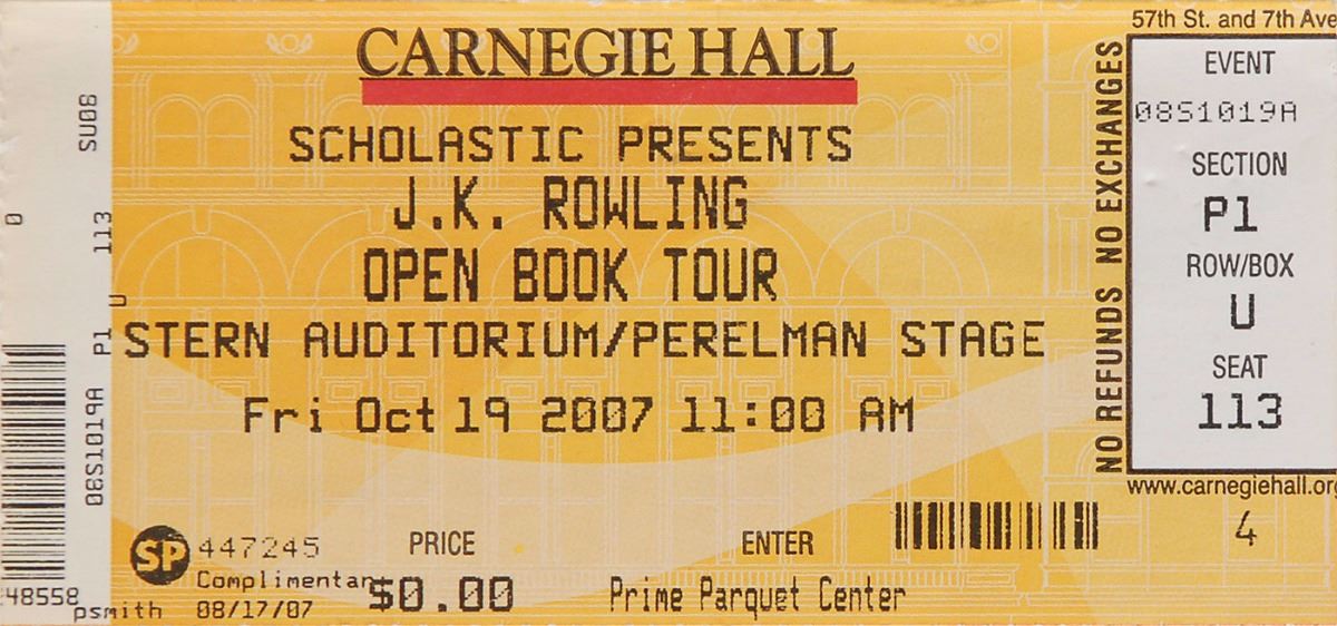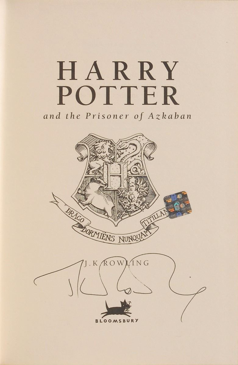 Signed book: Harry Potter and the Prisoner of Azkaban. Deluxe first edition, first printing. London: Bloomsbury, 1999. Hardcover, 6.25 x 9.5, 317 pages. Signed on the title page in black felt tip, “J. K. Rowling.” In fine condition, with a hologram affixed to the title page. Accompanied by a ticket stub from a Carnegie Hall book tour event in 2007. Bound in green cloth with an inlaid color plate and gilt stamping, this is a handsome signed example.