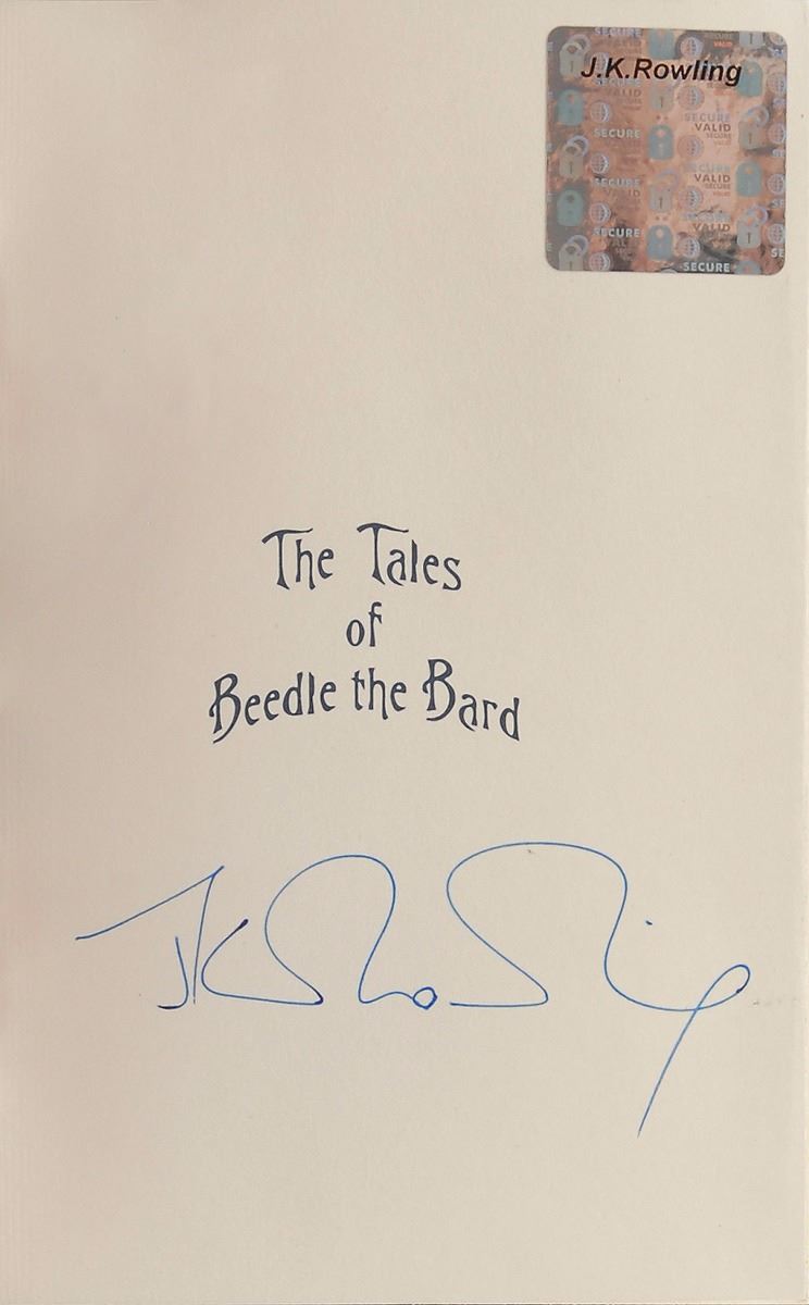 Signed book: The Tales of Beedle the Bard. Deluxe collector’s edition. London: Children's High Level Group, 2008. Ornately embellished hardcover with velvet bag and clamshell case, 4.75 x 6.75, 179 pages. Signed on the half-title page in blue ballpoint, “J. K. Rowling.” In fine condition, with small gouges to the spine of the clamshell case and a Rowling hologram affixed to the signed page. An impressive publication that is extremely rare in signed examples.
