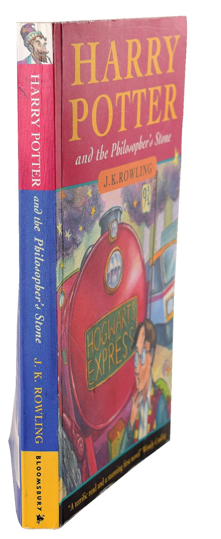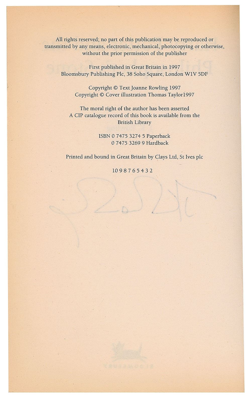 Signed book: Harry Potter and the Philosopher's Stone. First edition, second printing. London: Bloomsbury, 1997. Softcover, 5 x 7.75, 223 pages. Signed on the title page in black felt tip by J. K. Rowling. Autographic condition: fine. Book condition: VG/None, with light edgewear.