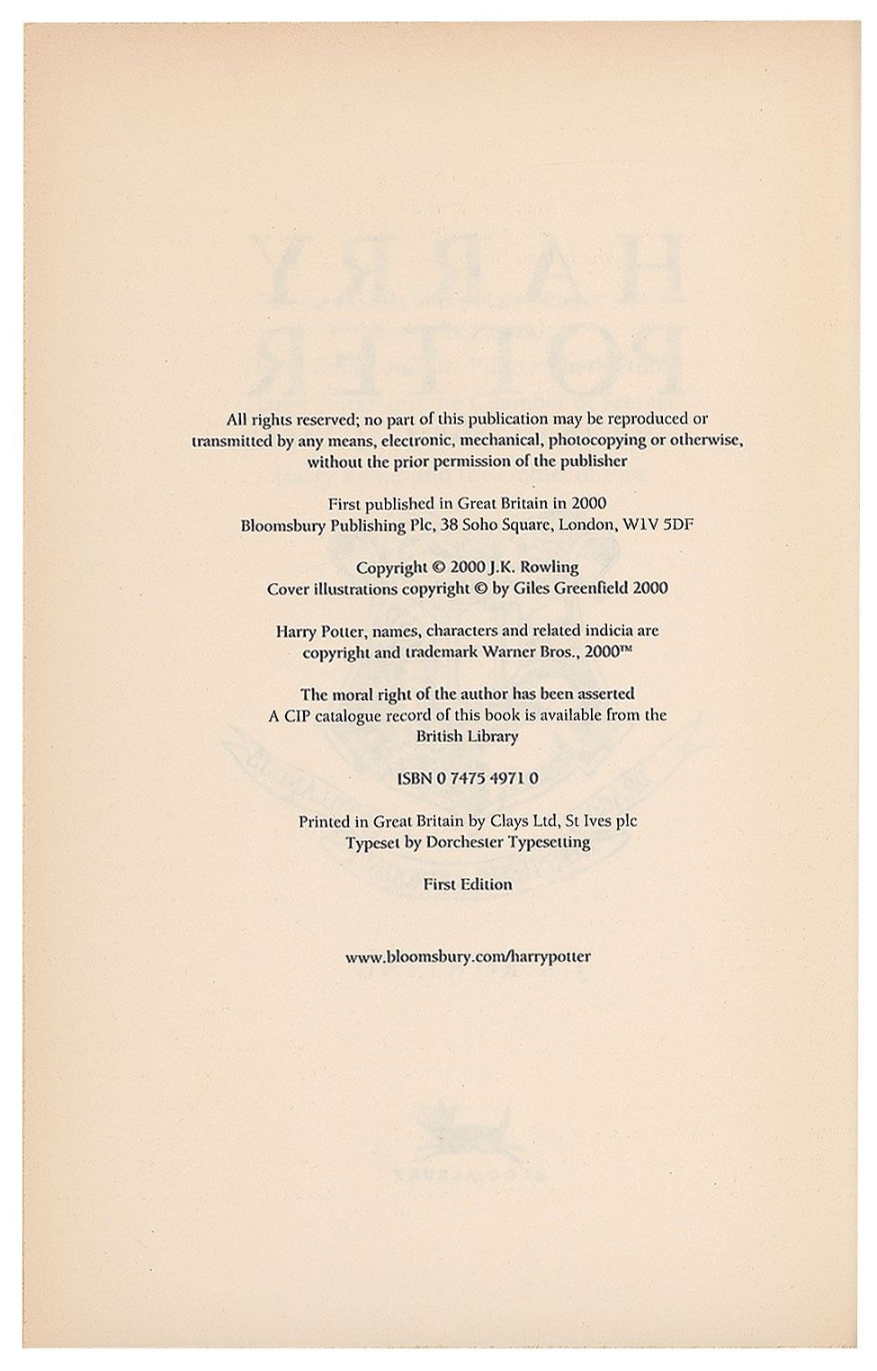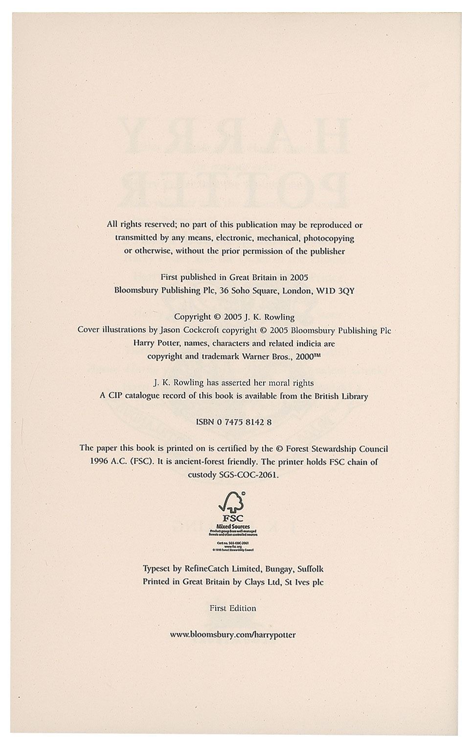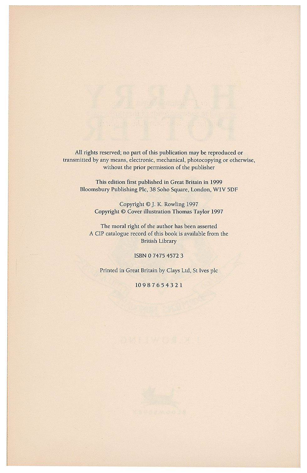 Complete set of seven deluxe hardcover books from the Harry Potter series, all first edition, first printing, published in London by Bloomsbury. Includes: The Philosopher's Stone (1997), The Chamber of Secrets (1998), The Prisoner of Azkaban (1999), The Goblet of Fire (2000), The Order of the Phoenix (2003), The Half-Blood Prince (2005), and The Deathly Hallows (2007). Overall book condition: NF/None. A gorgeous, deluxe set of one of the most popular successful modern-day fiction franchises.