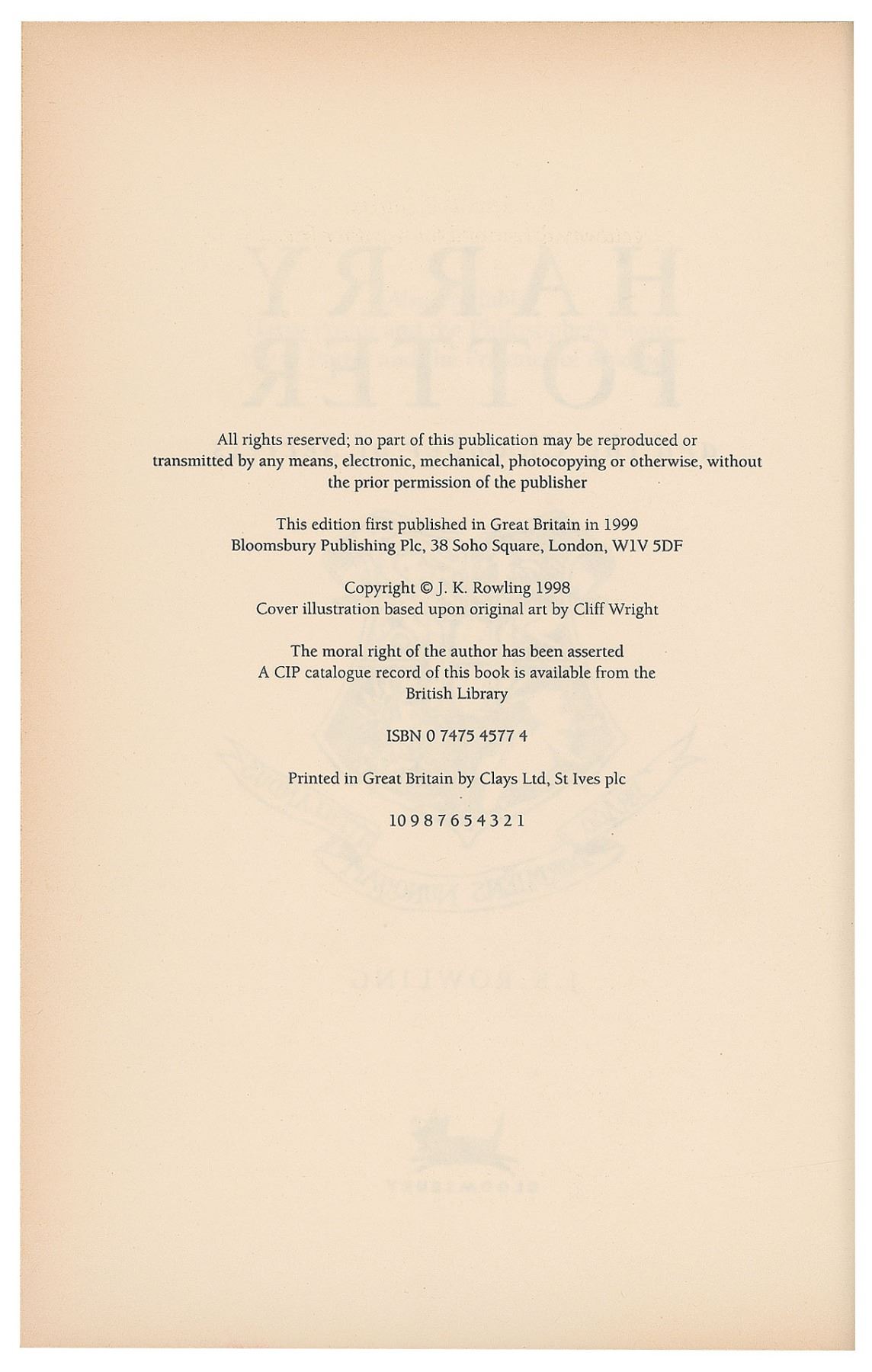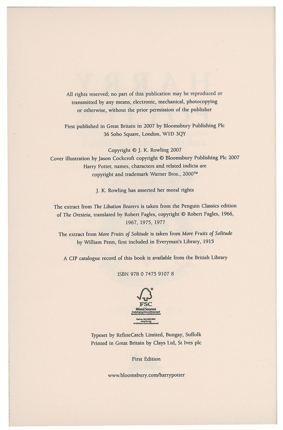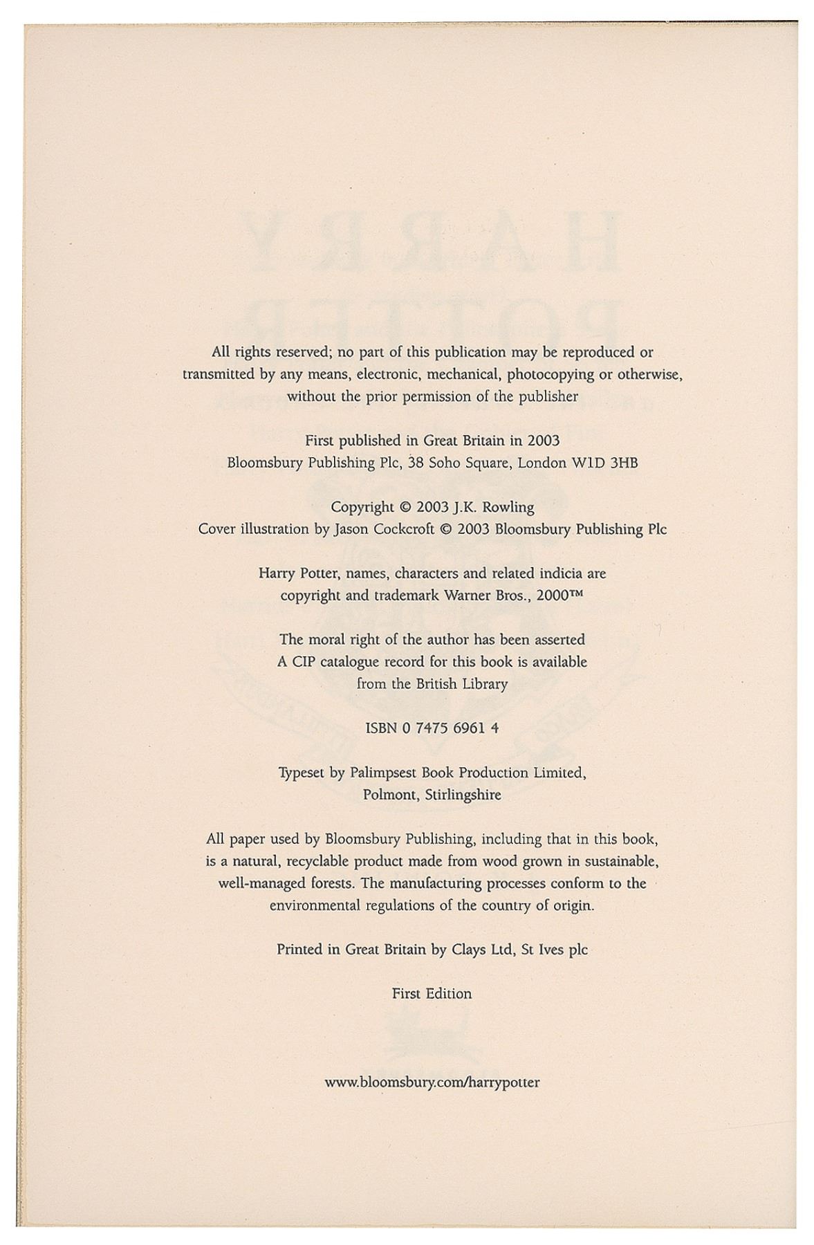 Complete set of seven deluxe hardcover books from the Harry Potter series, all first edition, first printing, published in London by Bloomsbury. Includes: The Philosopher's Stone (1997), The Chamber of Secrets (1998), The Prisoner of Azkaban (1999), The Goblet of Fire (2000), The Order of the Phoenix (2003), The Half-Blood Prince (2005), and The Deathly Hallows (2007). Overall book condition: NF/None. A gorgeous, deluxe set of one of the most popular successful modern-day fiction franchises.