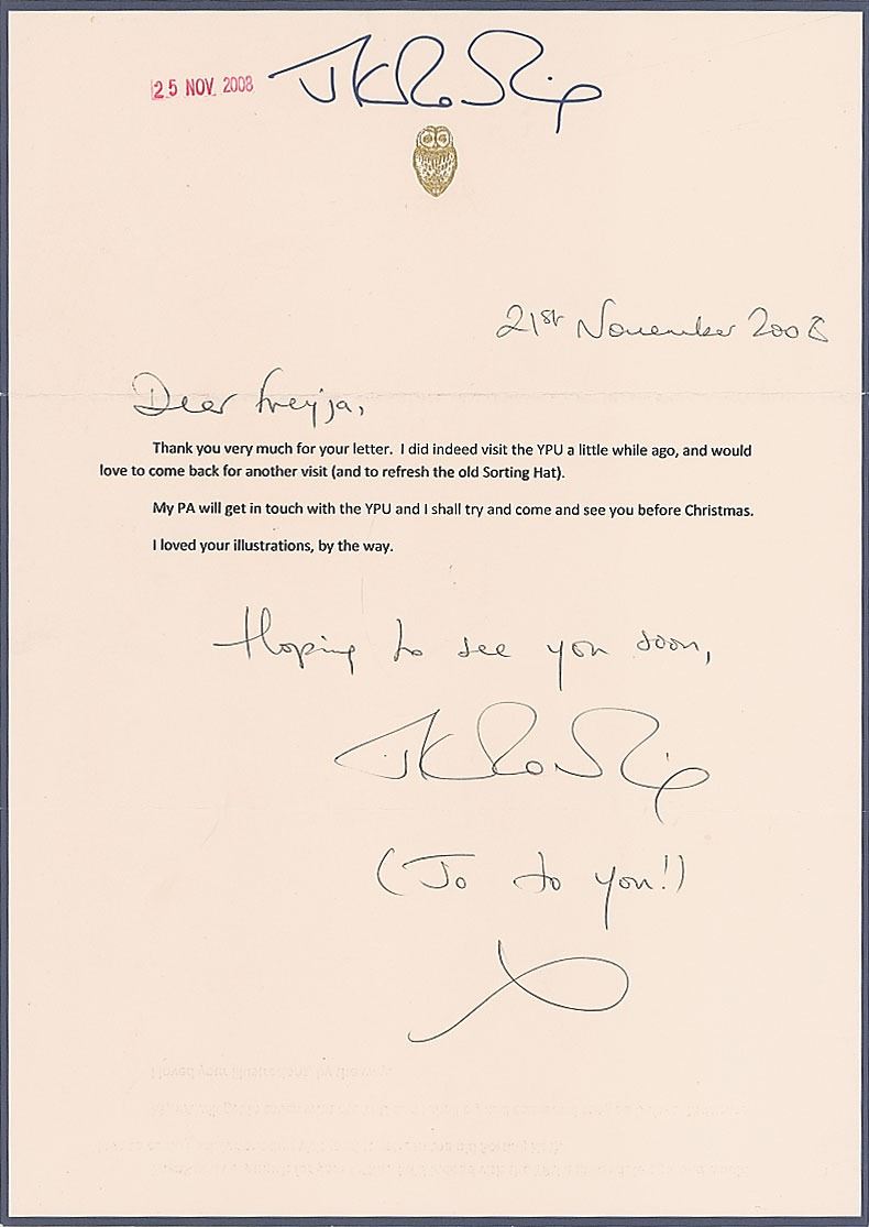 TLS, one page, 8 x 11.5, personal letterhead with her facsimile signature letterhead, November 21, 2008. Letter to "Freyja," in part: "I did indeed visit the YPU a little while ago, and would love to come back for another visit (and to refresh the old Sorting Hat). My PA will get in touch with the YPU and I shall try and come and see you before Christmas." She signs with a warm handwritten closing: "Hoping to see you soon, J. K. Rowling, (Jo to you!)." In fine condition. Accompanied by a full letter of authenticity from Beckett Authentication Services.