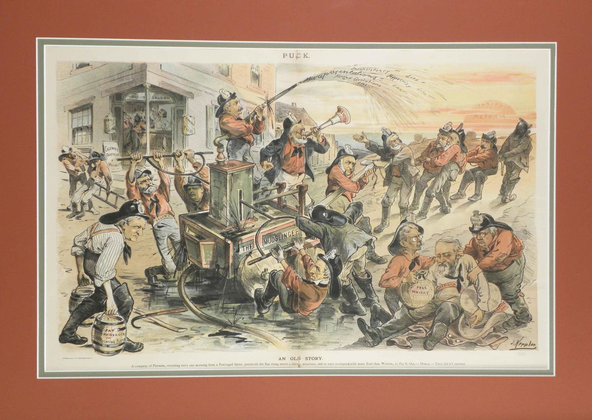 J. Keppler Magazine Print, depicting company of fireman returning early from a prolonged spree. J. Ottmann. Lithographer Puck Bldg New York. Framed under glass. 19 X 12 1/2 inches image only.