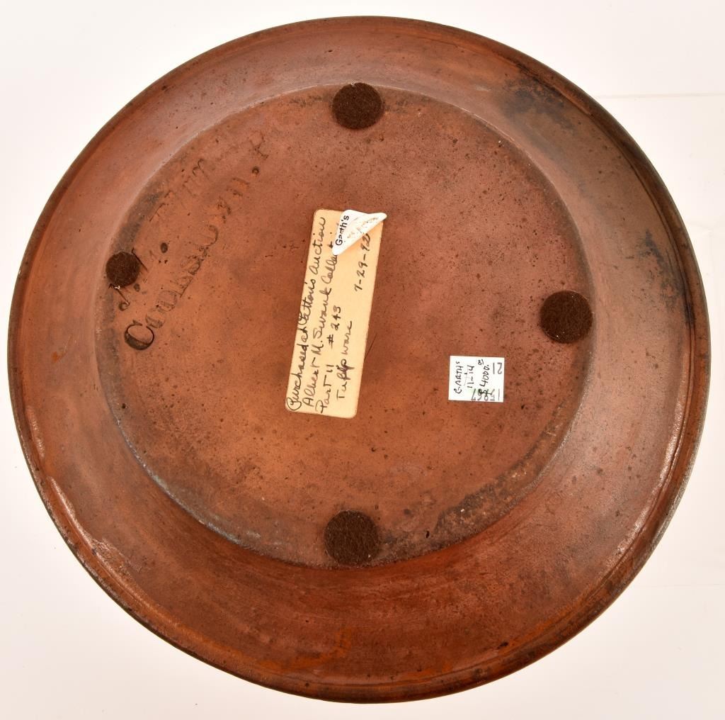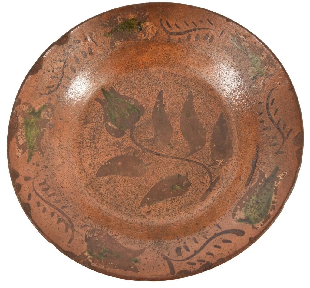 Rare multi-colored pie plate Cookstown, Pennsylvania, mid 19th century. Green and yellow slipware tulips. Impressed "J.L. Blaney, Cookstown, Pa". Imperfections include edge chips, some filled in, surface wear including loss to tulips. 11" diameter. Justus L. Blaney (1809-1875) was listed as a potter in Cookstown, Fayette County, Pennsylvania in 1850, but by 1860, he was reduced to the job of "day laborer" in Meigs County, Ohio, and then by 1870, had moved to Muskingum County, Ohio, and described himself as a "farm laborer".