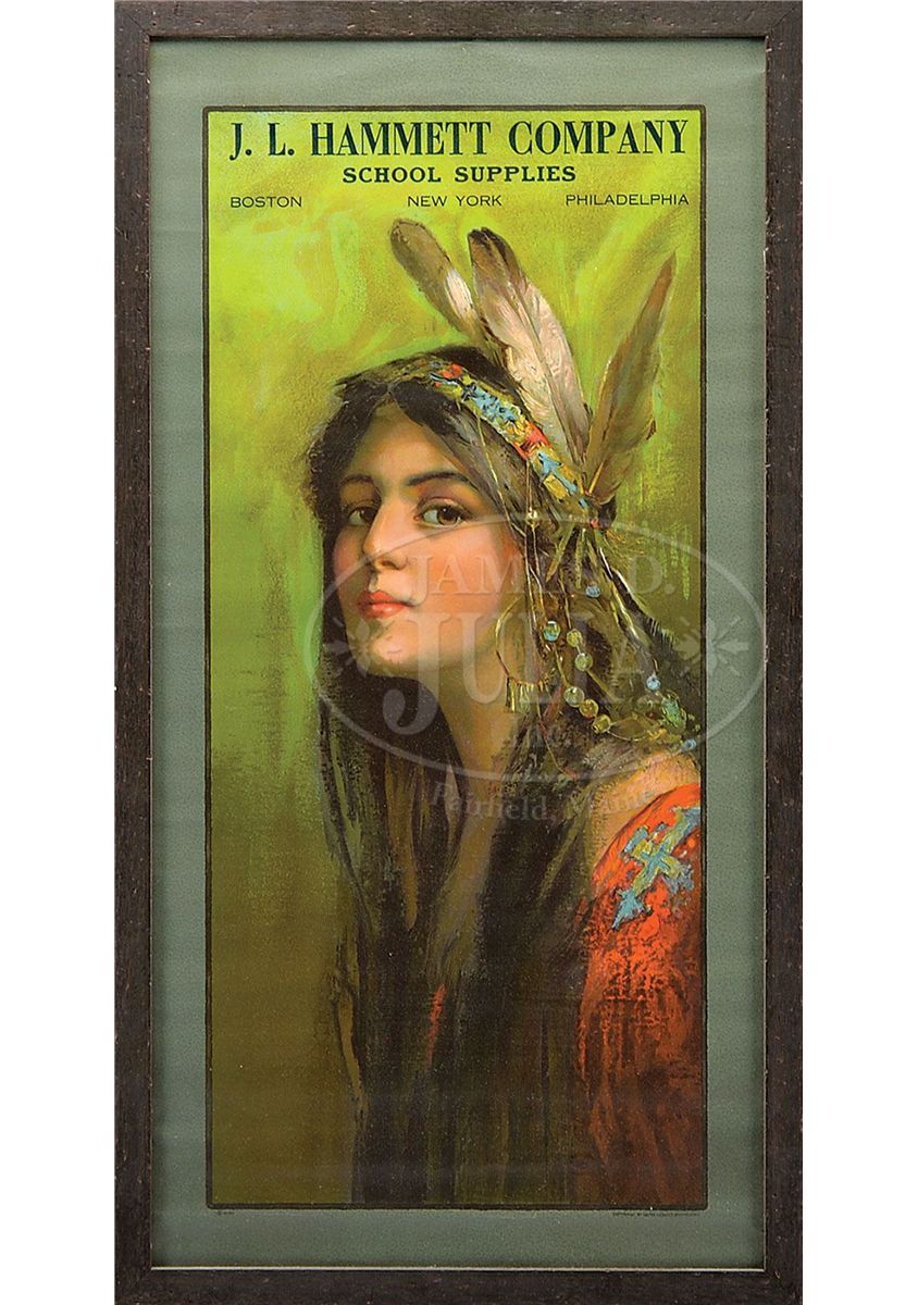 PLEASE NOTE (11/13/13): There are green bands at top and bottom. Colorful stone litho of a feathered and bejeweled Native American Indian is used to promote this firm's line of school supplies. Copyright Hayes Litho Co. Buffalo, N.Y. for the J.L. Hammett Co. of Boston, New York and Philadelphia. SIZE: Sight size - 14-1/2" w x 29-3/4" t. CONDITION: Near excellent; soft roll crease at bottom margin. 1-13180