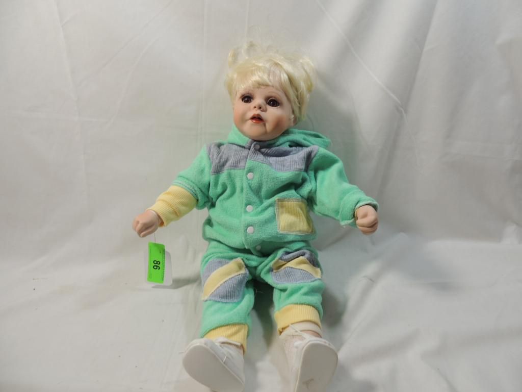 J LYNNE PORCELAIN DOLL IN SWEAT SUIT BLONDE HAIR AS SHOWN. SEE PHOTO FOR MORE DETAILS.