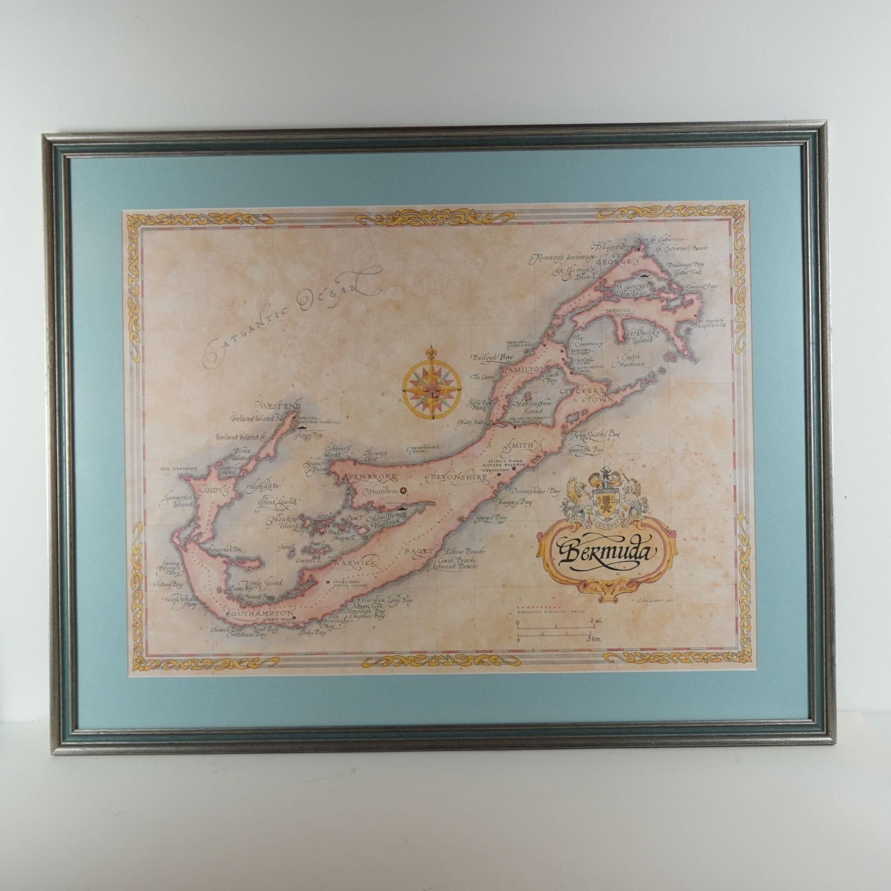 A decorative map of Bermuda illustrated by J. Longacre in 1991, designed in the style of an early cartographic chart. The map features detailed place names, a compass rose, and the island's coat of arms with the Latin motto Securitas Constantia Luuctus. Executed in warm tones with faux-aging effects, it presents a stylized representation of the island surrounded by the Atlantic Ocean. Signed and dated lower right. Presented matted in blue and framed under glass with a silver-tone frame.