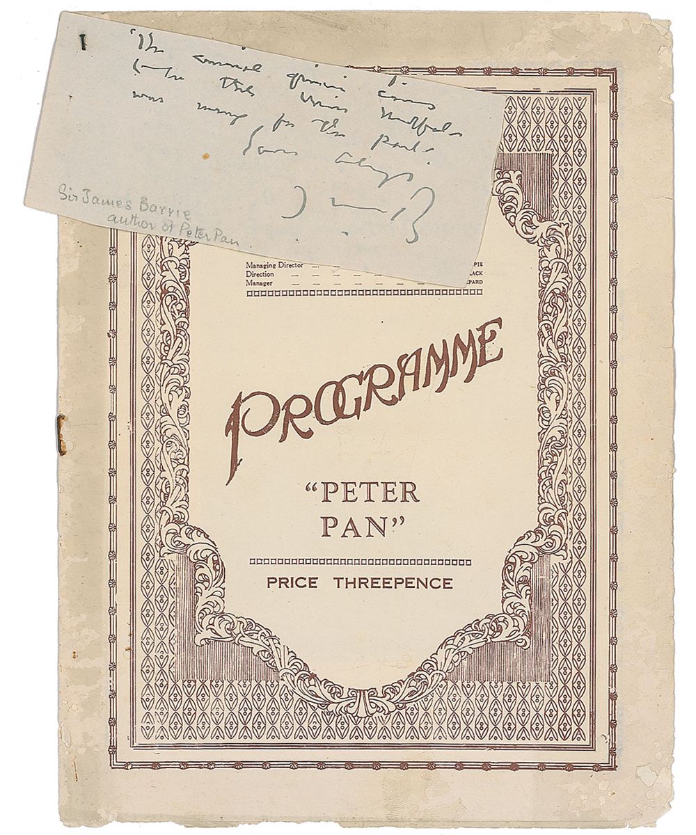 Scottish author and dramatist (1860–1937) best known for the classic children’s play Peter Pan. ANS signed “J. M. B.,” one page, 5.5 x 2.5, no date. Brief note regarding the casting of a play. In full: “The general opinion seems to be that Miss Moffat was wrong for the part.” Attached by a tack to a program for a performance of Peter Pan on January 31, 1933. Autograph in fine condition; noticeable edge tears and holes to the program.