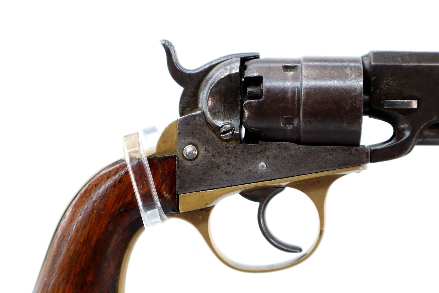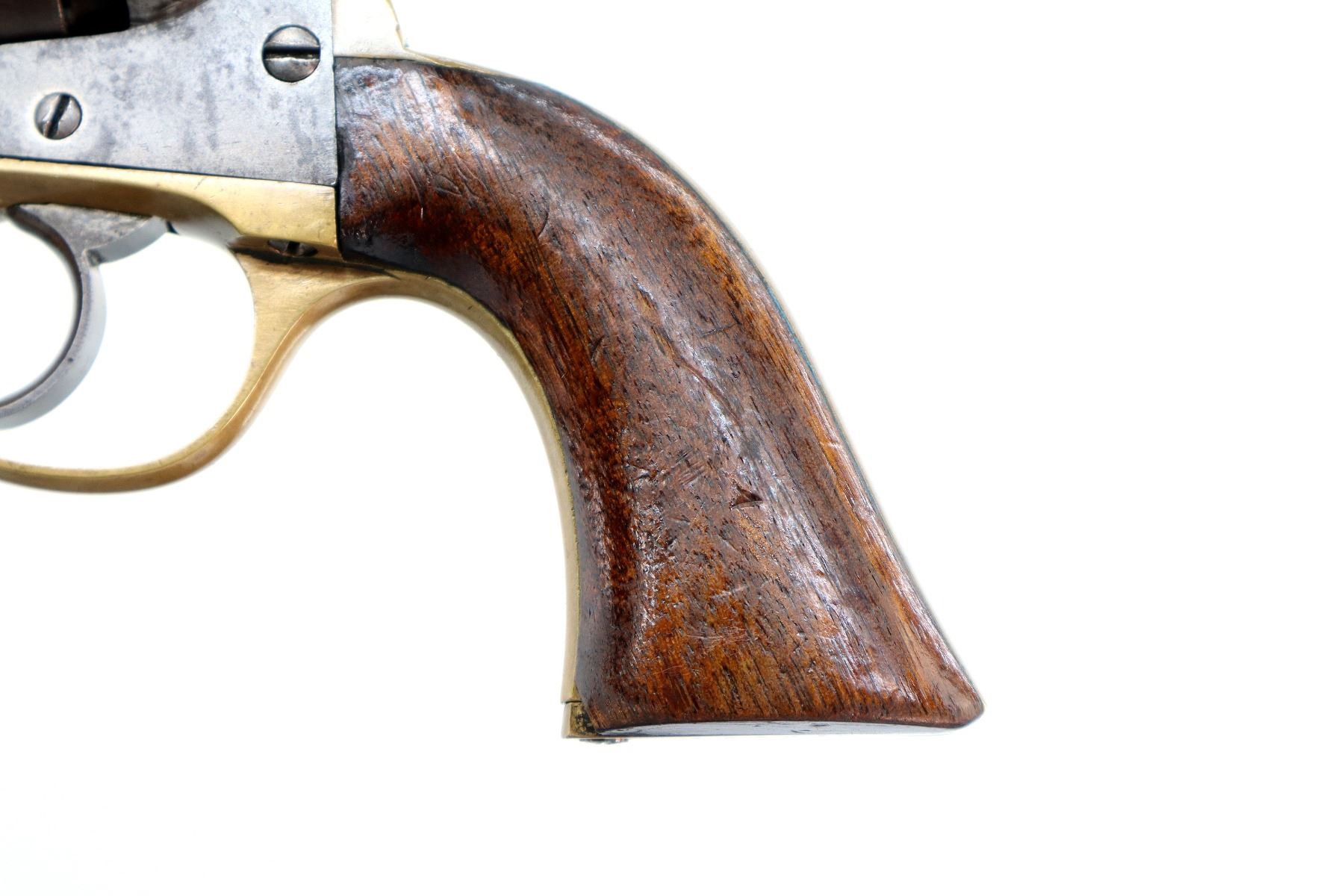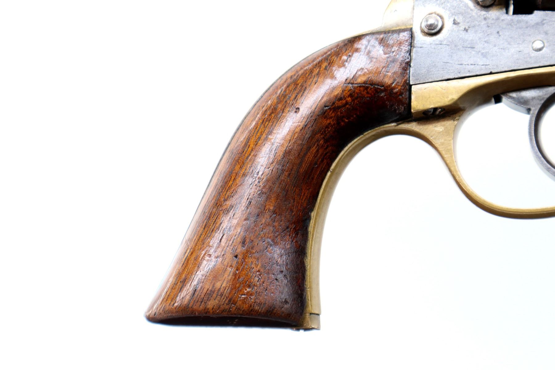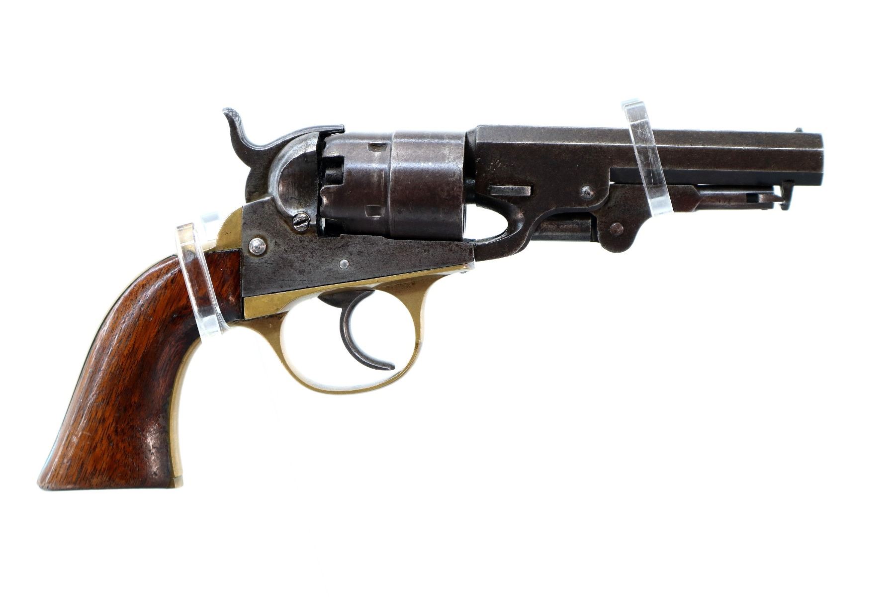 Main Description: Functions mechanically as designed, Holds cock, cylinder does not index properly. Manufactured 1850-1864, approx. 15,000 produced. Brass bead, octagon barrel, smooth cylinder, checkered spur hammer and smooth trigger, brass trigger guard and back strap. Two piece wood grips, both have small chips, loading lever under barrel.