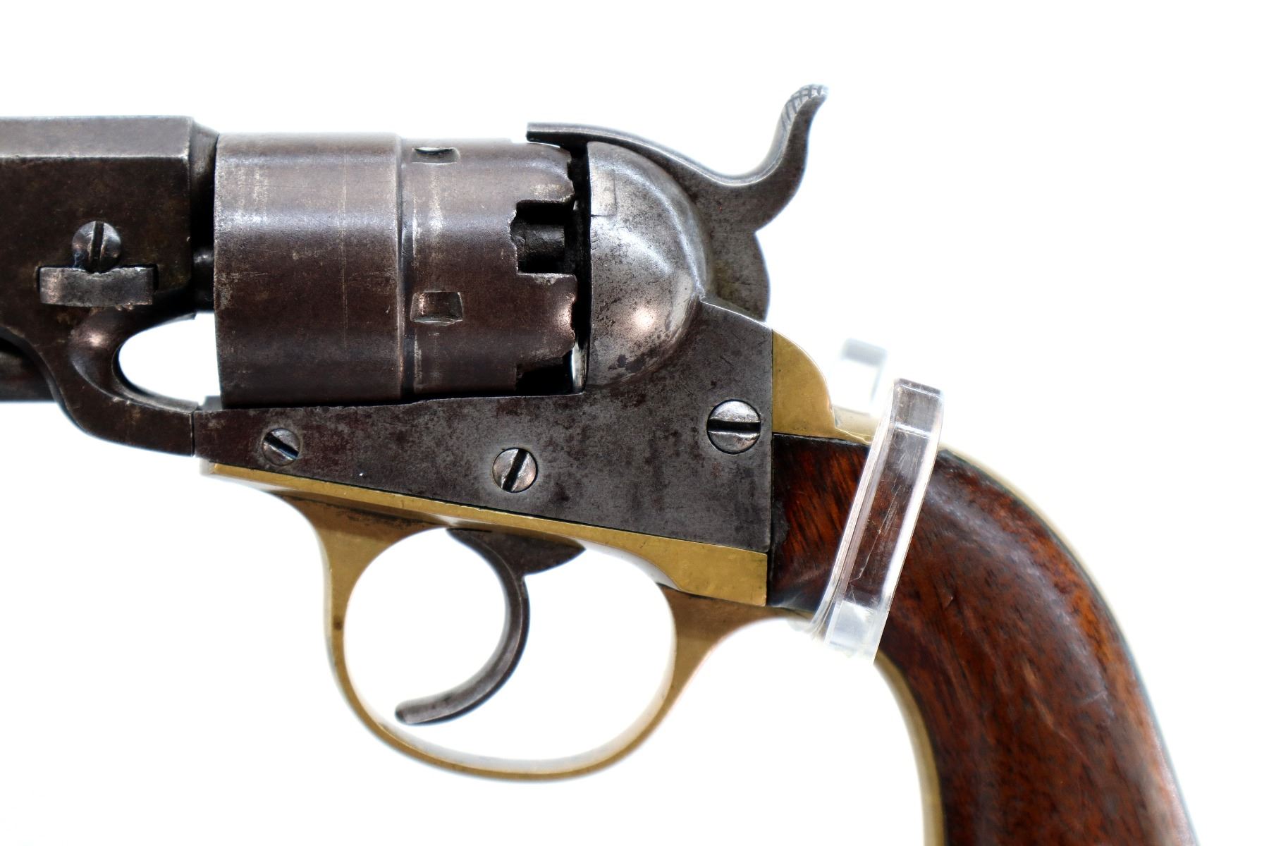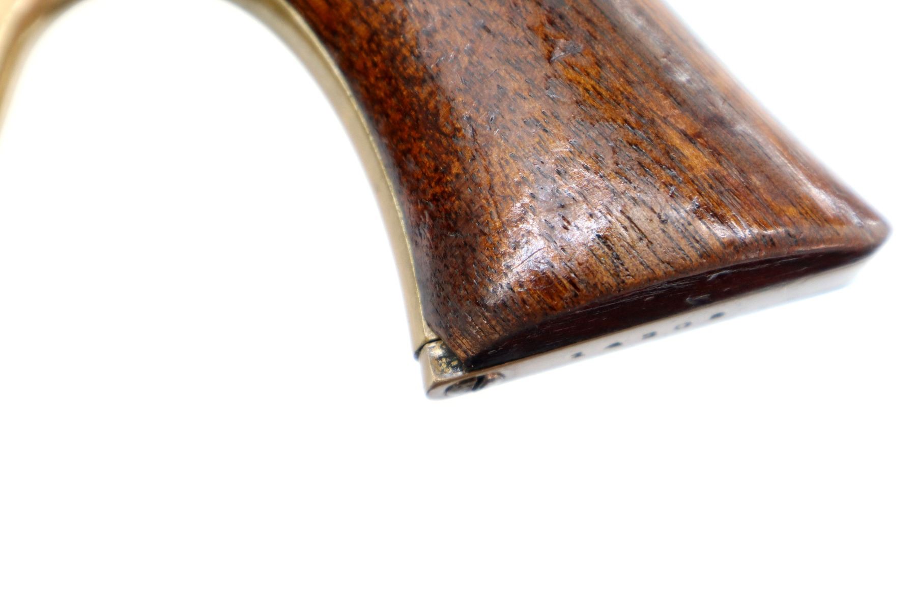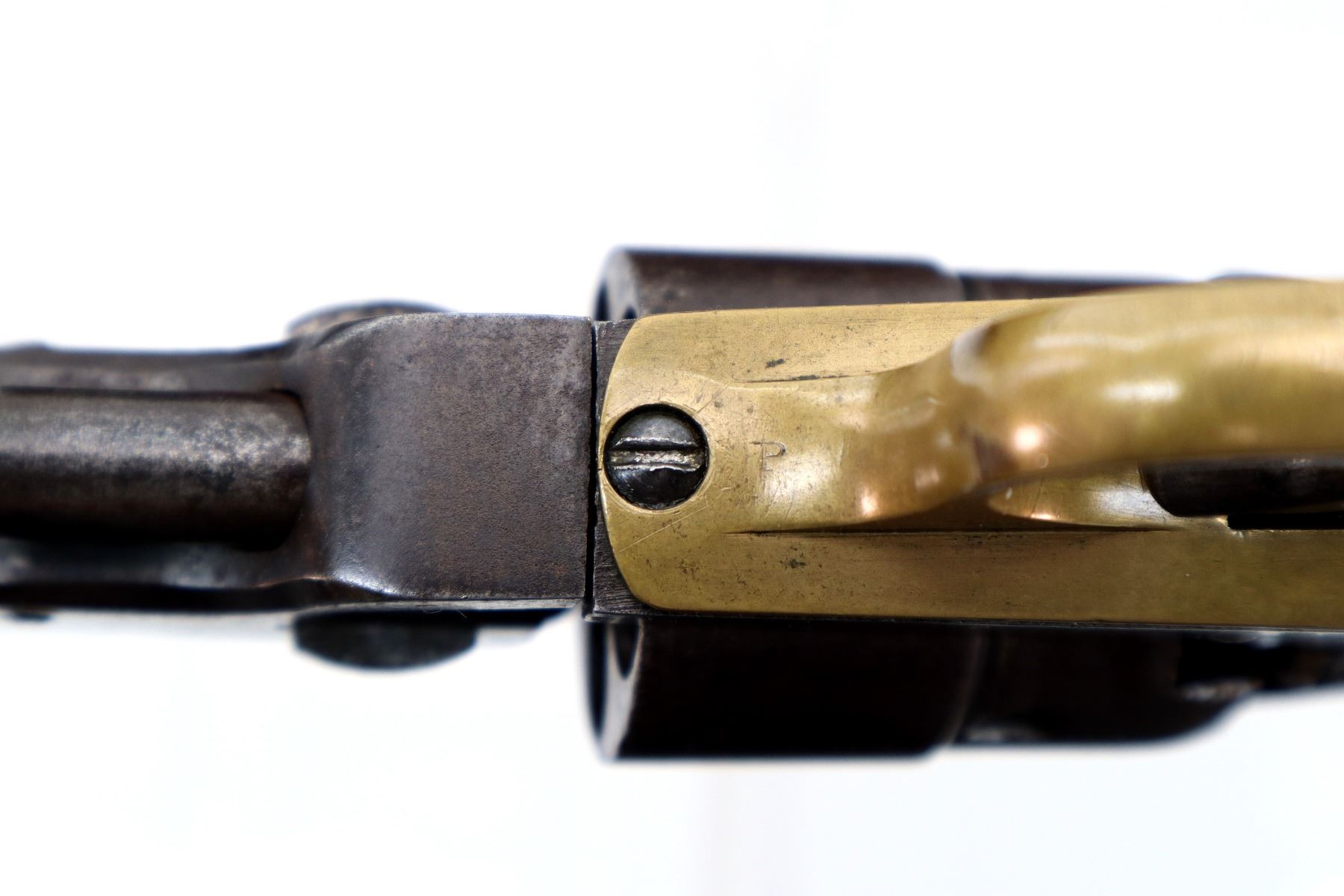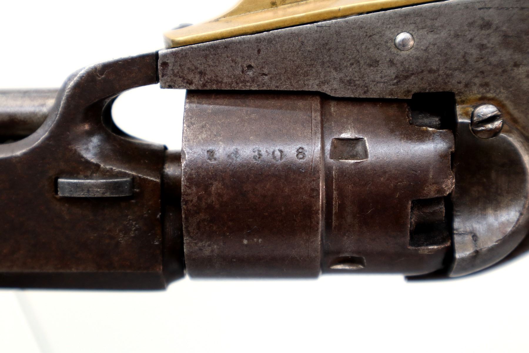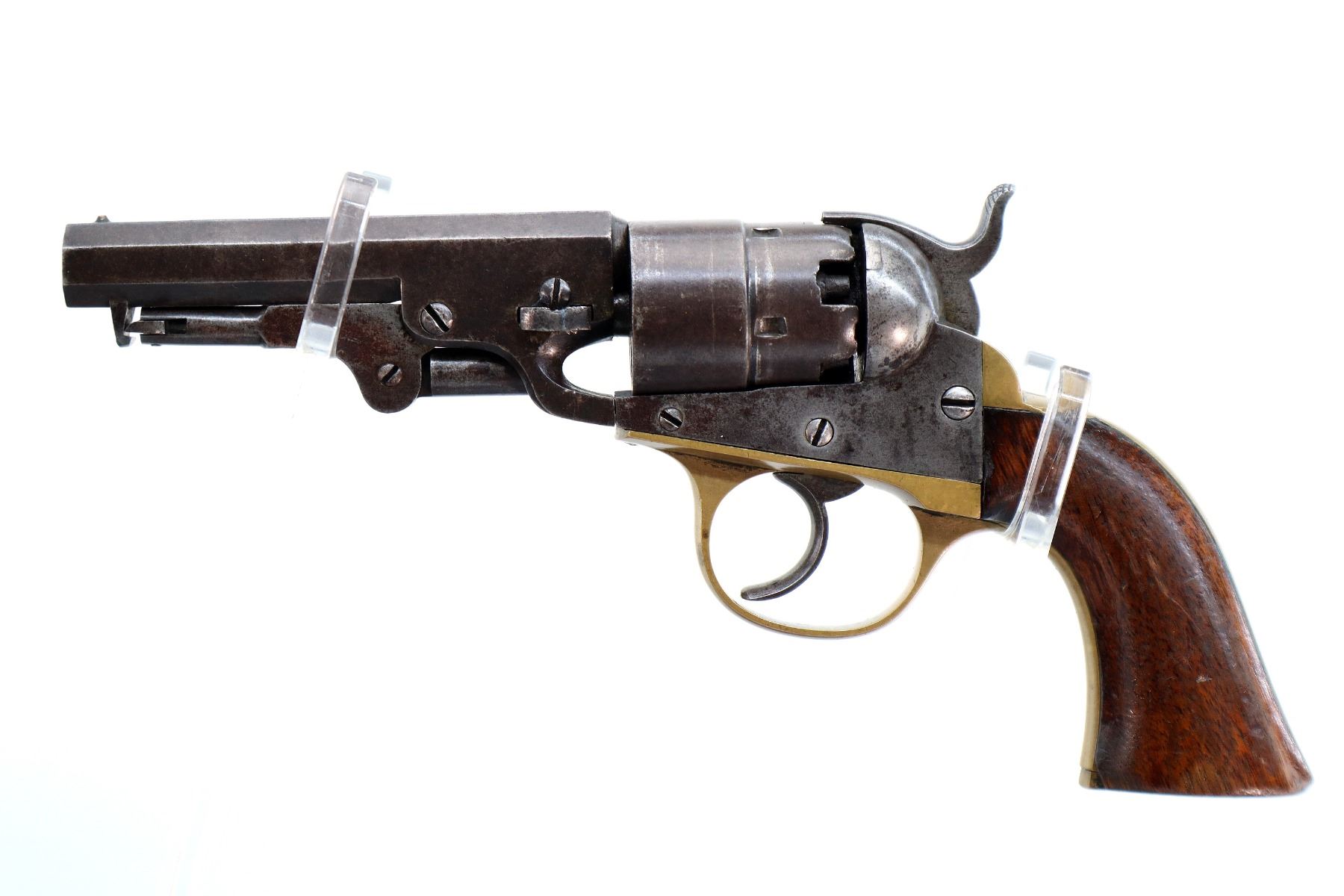 Main Description: Functions mechanically as designed, Holds cock, cylinder does not index properly. Manufactured 1850-1864, approx. 15,000 produced. Brass bead, octagon barrel, smooth cylinder, checkered spur hammer and smooth trigger, brass trigger guard and back strap. Two piece wood grips, both have small chips, loading lever under barrel.