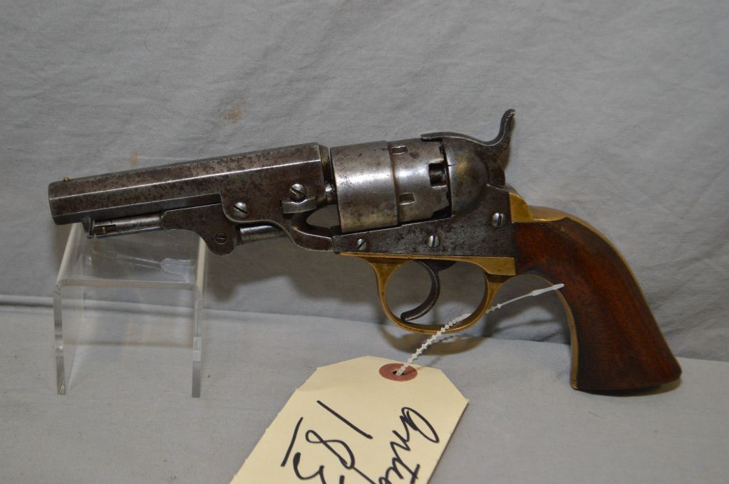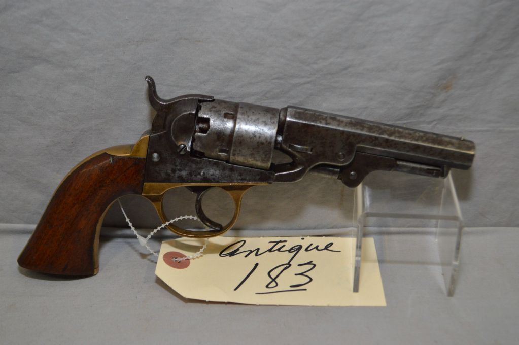 J.M. Cooper Model Navy D.A. 2nd Model .36 Perc Cal 5 Shot Revolver w/ 4" octagon bbl [ patchy blue finish, brass trigger guard & gripi strap with old patina, good one piece walnut grips, barrel markings " Cooper Firearms Mfg Co. Frankford, Phila P.A. Pat. Jan 7,1851 Apr.25, 1854, Sep.4,1860, Sept. 1,1863, Sept.22, 1863 in three lines", matching numbered cylinder, Circa 1864 - 1869, Prod Quanities Approx 15,000 ] Ser # 3142 ANTIQUE NO PAL REQ