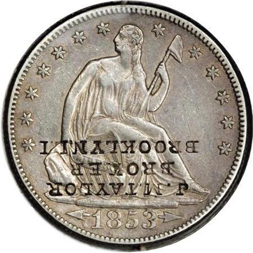 <B>J.M. Taylor Broker Brooklyn L.I. Counterstamped Half Dollar.</B></I> Brunk T-94, Rulau NY-2012. This is a well known counterstamp, but only two are known with the L.I. counterstamp on Seated Liberty half dollars. This is a choice Extra Fine example, both on the host coin and the die-stamping itself. <BR><BR><b>Shipping:</b> Coins & Currency (<a target="_blank" href="http://www.heritageauctions.com/common/shipping.php">view shipping information</a>)