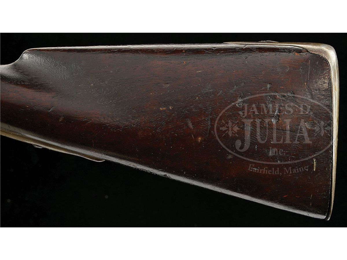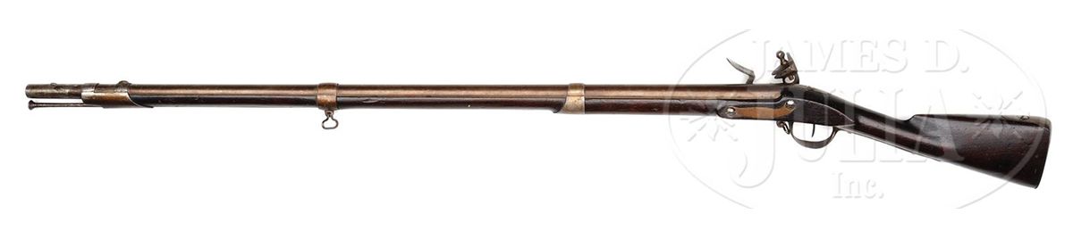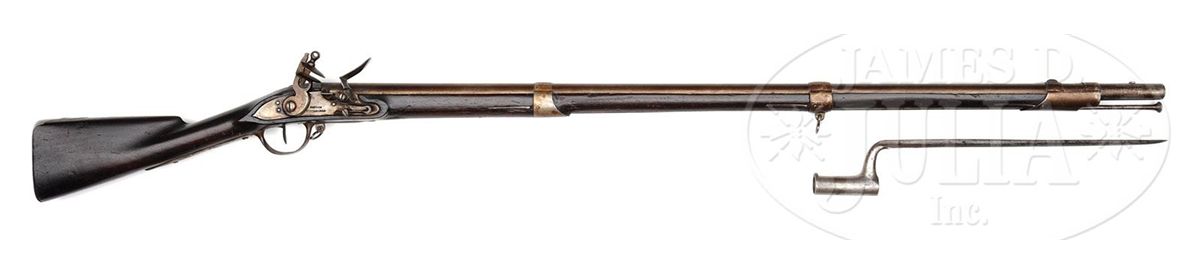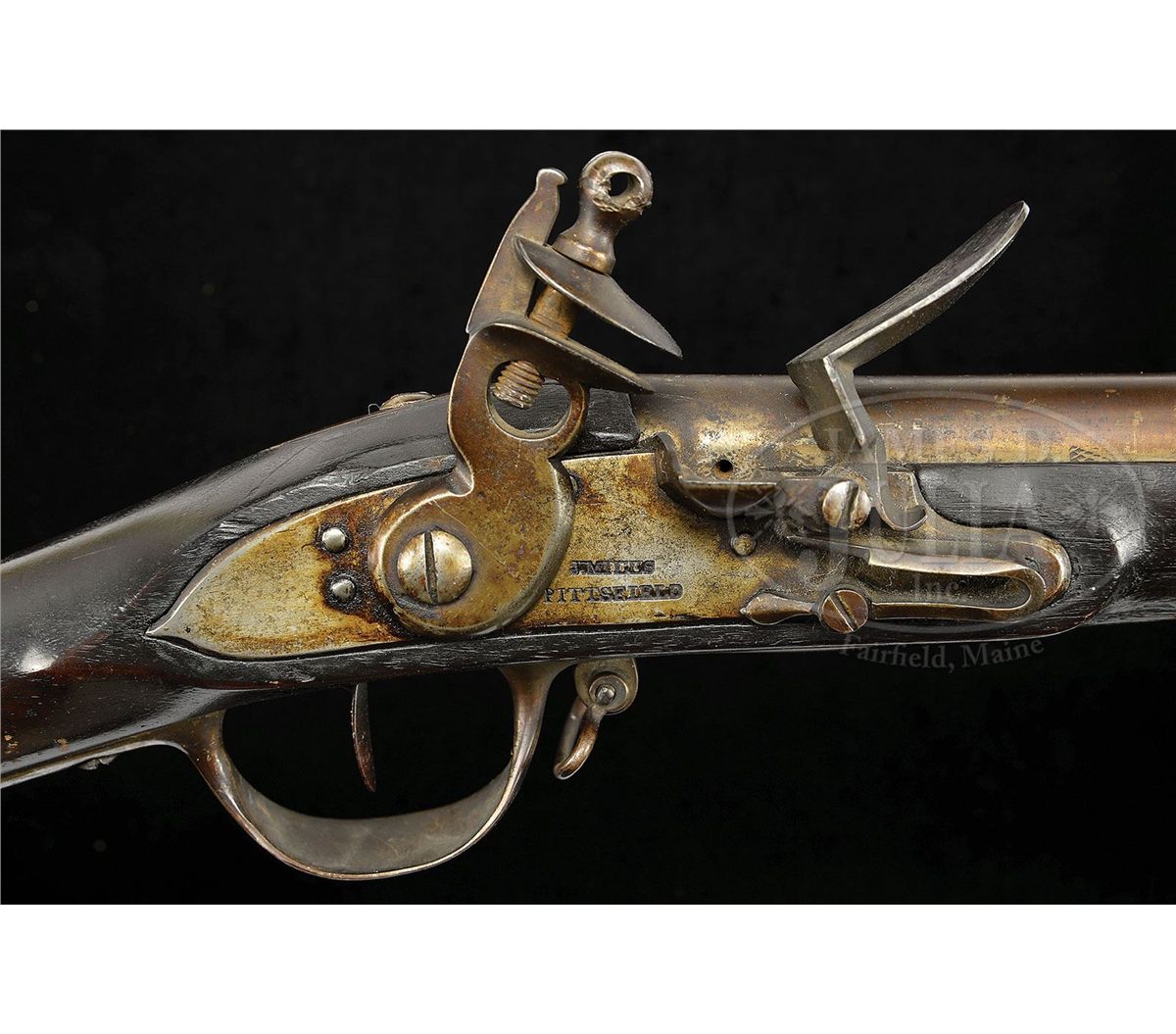 PLEASE NOTE (10-12-13): Musket has an old replacement frizzen. NSN. .71 Cal. x 41-3/4" long unmarked bbl. 6-1/4" long lock marked "J. MILLS" / "PITTSFIELD". Barrel bands, trigger guard, buttplate and sideplate are all US 1808 period furniture. Bayonet lug set back 1-1/4" from muzzle. Accompanying gun is an orig US bayonet of the correct type having a 14-1/4" long blade marked "CC" at back of blade. Black walnut stock is 53" long unmarked and also shaped in the same 1808 period of US military musket, ramrod and sling swivels appear to be orig making this gun 100% complete and orig. Jason Mills of Pittsfield. Massachusetts was a private maker of muskets and his armory was sold to Lemuel Pomeroy, whose muskets continued to be made under U.S. Government Contract until the mid-1840's when the Pomeroy's decided making musket was no longer profitable. CONDITION: Bbl and lock are in fine condition and show no evidence of usage, only hardened grease which also matches color of furniture. Walnut stock is excellent condition with no cracks, splits, or losses, only a few minor handling dents. Overall this musket is in very fine condition. 4-49308