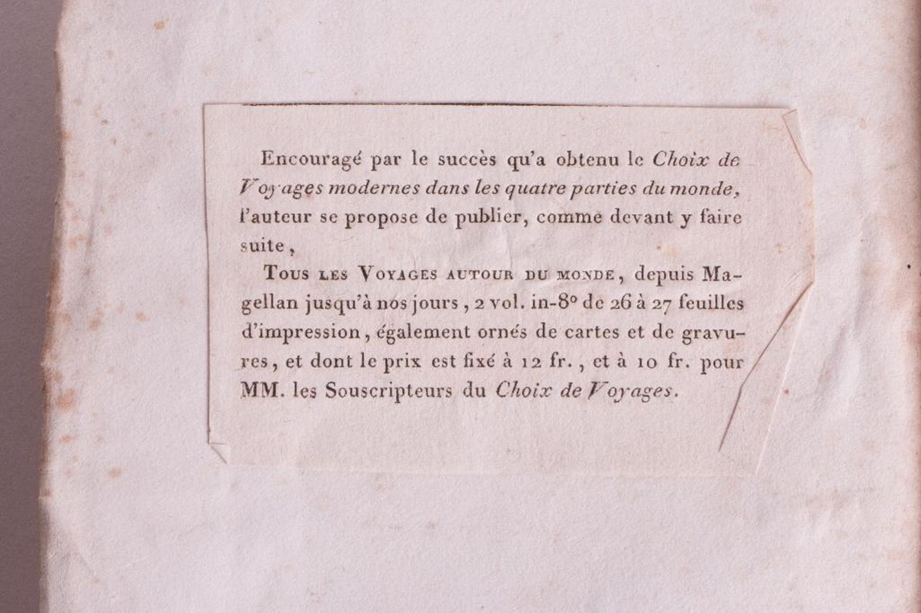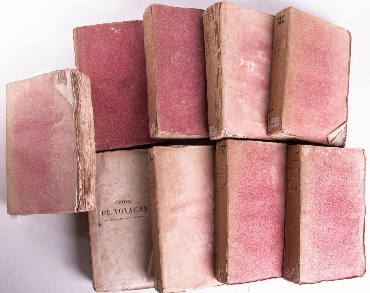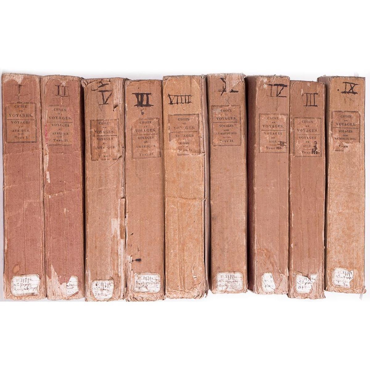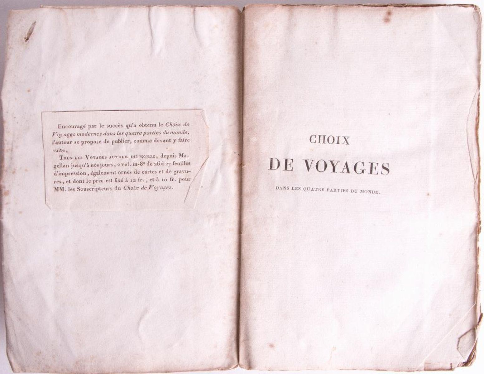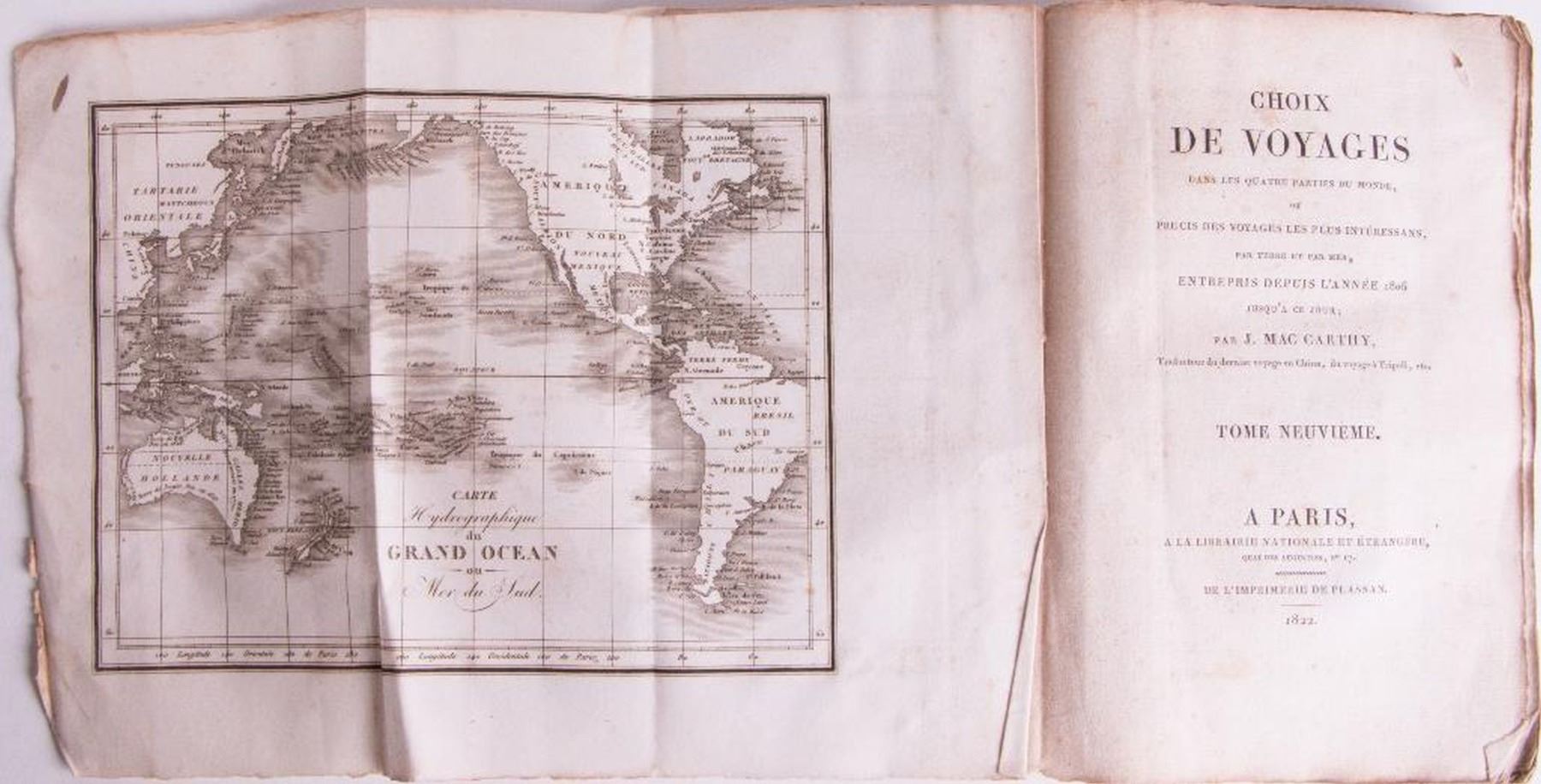 Title:Choix de voyages dans les quatre parties du monde, ou precis des voyages les plus interessans, par terre et par mer, entrepris depuis l'annee 1806 jusqu'a ce jour. Author: J. MacCarthy Place: Paris Publisher: A La Librarie Nationale et Etrangere, Date: 1821-1822 Description: 10 volumes. Softcover. Illustrations, and fold out maps. Condition: Fair- good condition. Some foxing to pages. Discoloration of covers. One cover is missing. Some slight water damage-spotting to volumes.