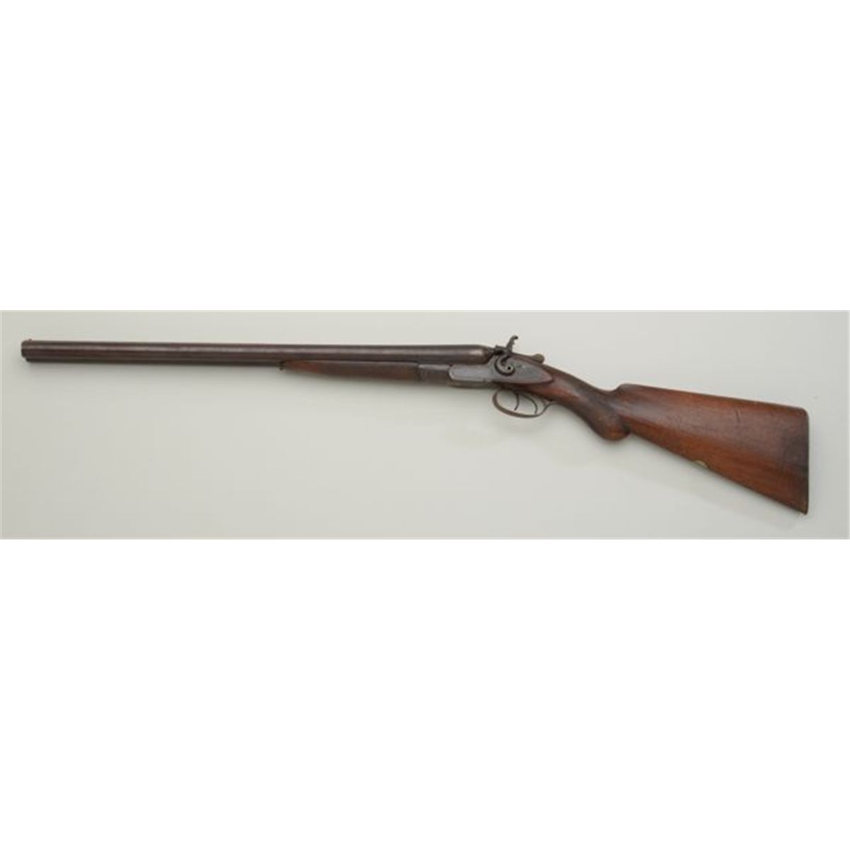 J. Manton & Co. exposed hammer side by side shotgun, serial #6968. 12 gauge, 22" Damascus barrels, checkered walnut stock. Action is good, gun is in fair to good condition overall, retaining screw for theleft hammer is missing. Barrels show dark patina. Estimate: $100 - $200