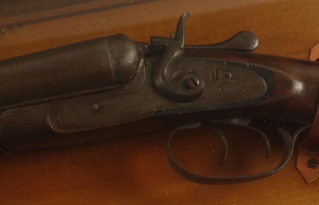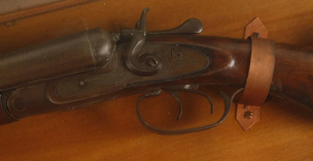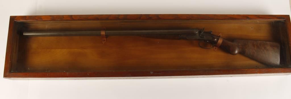 Sealed in a wood shadow box is this finely engraved rabbit-eared, 32" damascus barreled, double-barrel, side plate, breech-loading shotgun. English made. The wood is of a fine select grade.