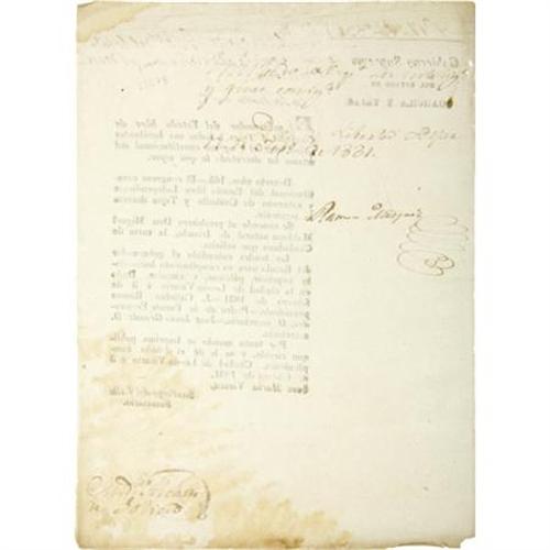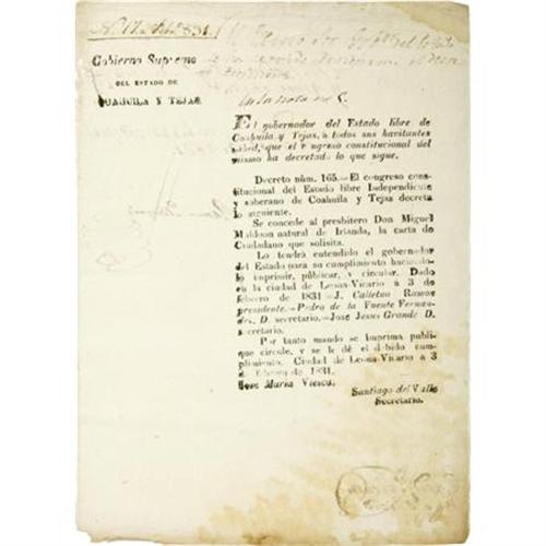 <B>[Broadside]</B></I><B><I> El Gobernador Del Estado Libe de Coahuila y Tejas Grants a Citizenship Card to Father Michael Muldoon.</B></I></B></I> [Texas]. [Leona Vicario]. February 11, 1831. One page, Octavo. Docketed on verso in manuscript. This broadside decree was issued by Jose Maria Viesca and promulgated by Ramon Musquiz authorizing a citizenship card to Michael "Miguel" Muldoon, friend of Stephen Austin. <BR><BR>Michael Muldoon was born in Ireland around 1780. Muldoon is believed to have arrived in Veracruz in 1821 in the company of Juan O'Donoju, the last Spanish viceroy of Mexico, and from there he pursued his religious calling at the Diocese of Monterrey. By February of 1831, Muldoon was ready to assume his duties as a priest but prior to doing so, was granted a citizenship card by the Governor of Coahuila and Texas, made official by this decree. Muldoon was the only priest appointed to serve non-Hispanic Texas settlers, and he served in this capacity for several years. In 1836, Father Muldoon sold his Texas land to his friend Stephen Austin and never returned in any official capacity. He is remembered briefly in Texas history books; in Hostyn, Texas where there is a marker noting his contributions to early Texans; and by the small Texas town near La Grange that was named for him. Half-leather case, gilt lettering. In fine condition. <I>From the collection of Darrel Brown.</B></I><BR><BR><B>Reference:</B></I> Not in Streeter <I>Texas</B></I>, although he makes reference to its existence in the Bexar Archives under a different entry (808).<BR><BR><b>Shipping:</b> Books & Catalogs (<a target="_blank" href="http://www.heritageauctions.com/common/shipping.php">view shipping information</a>)