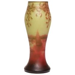 J. Michel vase, cameo cut scene of boats on the water with mountains in the background, orange, brown and green against a yellow ground, cameo signature, 12.5”h, some manufacturing flaws