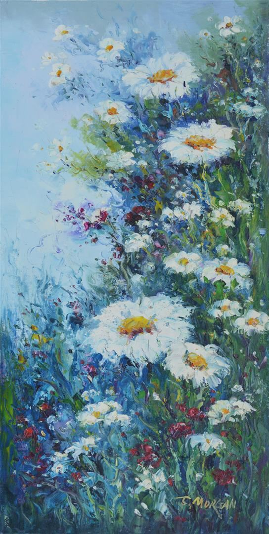 Artist: J Morgan - Title: Reflections on the Water - Medium: Original Oil on Canvas - Signature: This one-of-a-kind work is hand-signed by the artist at the bottom of the image - Image Size: Approximately 24 inches x 12 inches - Framed: Unframed on Unstretched Canvas - Details: This work comes with a Certificate of Authenticity - Biography: J. Morgan was born in 1959 in the South Gyeongsang Province of Korea. When he first began his artistic career, he focused primarily on figure drawing, but after a visit back to his hometown, he discovered his passion for nature and began painting landscapes and florals. Since then, his oil paintings have always reflected his hometown atmosphere. - As an adult, Morgan spent years traveling Italy and became inspired by the culture and beauty of Tuscan nature. After being influenced by many Impressionist artists throughout his journey, he established his own style with his aesthetic experiences from Tuscany. The sunlight is almost palpable on the bright fields of flowers he depicts in his pieces, while his poppy oil paintings featuring metallic paints mixed with vibrant pops of color bring a contemporary element to his Impressionist methods. - He recently visited Taiwan to study its cultures where he developed unique color palettes and techniques based on his observations. With the blending of Eastern and Western influences in his art, his hope is to continue evolving as an artist and create original paintings that are entirely unique and genuine.Since the year 2002, J. Morgan been exhibiting at New York Art Expo and has been a member of Art Power for several years now. Morgan's artwork can be found in select fine art galleries and private collections throughout the United States and around the world.