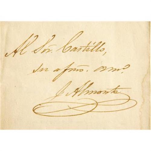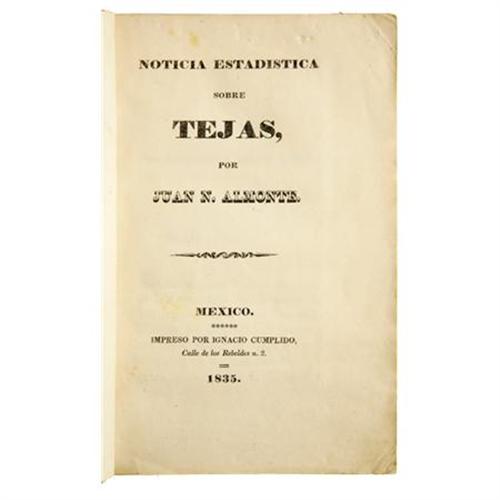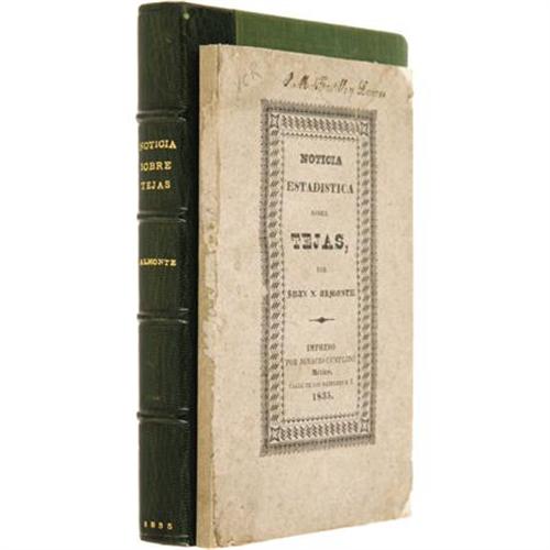 <B>Juan Nepomuceno Almonte, </B></I><B><I>News and Statistics on Texas </B></I></B></I><B>Signed</B></I> "<I>J. Almonte</B></I>," inscribed by him to Sn Castillo, 96 pages, 4" x 6". First Edition. Streeter 816. Gray paper wrappers stamped "<I>J.M. de Castillo y Lancas</B></I>" in upper margin of front cover imprinted: "<I>Noticia/Estadistica/Sobre/Tejas,/por/Juan N. Almonte./Impreso/por Ignacio Cumplido,/Mexico,/Calle de los Rebeldes N. 2,/1835.</B></I>" Fine condition. With mileage table and charts. Front corners rounded. This book is based on a visit made to Texas by Juan Nepomuceno Almonte (1803-1869) in the spring of 1834, at the orders of the Mexican government, to hear the complaints of the Texans and to gain time for the government to devote its attention to Texas matters. He arrived at Nacogdoches by way of New Orleans in May 1834, and had reached Monclova on his way back to Mexico City in September 1834. Almonte made his report to Valentin Gomez Farias, Vice President and temporary acting president of Mexico, and then compiled the non-political elements into his book, which was published in February 1835 and has a dedication to General Miguel Barragan dated Mexico, January 1, 1835. On January 28, 1835, Santa Anna surrendered the presidency to General Miguel Barragan, who died in office on March 1, 1836. It includes descriptions of towns, roads, ports, and people, as well as a detailed description of the physical terrain. There are sections on the Indian tribes and on wildlife, flora, and fauna. Almonte also urges colonization of Texas by Mexicans and states that he expects to return soon to Texas as Commissioner of Colonization. When he did return, it was as military aide on the staff of Santa Anna's invading army; he was taken prisoner at San Jacinto. This is the only known presentation copy in private hands. In cloth chemise (book and biographical information tipped in) and quarter morocco slipcase case with the spine in five compartments with four raised bands, lettered in gilt, "<I>Noticia Sobre Tejas/Almonte/1835</B></I>." Presentation copies of this book are exceedingly rare. <I>From the collection of Darrel Brown.</B></I><BR><B><BR>Reference:</B></I> Streeter 816; Eberstadt 162:15<BR><BR><b>Shipping:</b> Books & Catalogs (<a target="_blank" href="http://www.heritageauctions.com/common/shipping.php">view shipping information</a>)