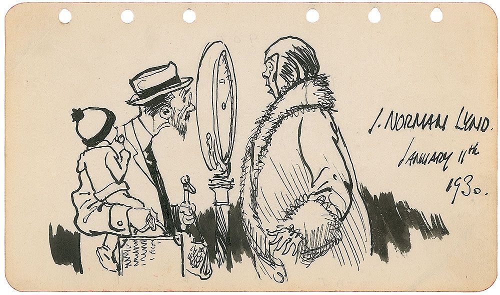 Detailed original vintage signed ink sketch of realistic characters on an off-white 6 x 3.5 album page, signed in black ink, “J. Norman Lynd, January 11th 1930.” In fine condition.