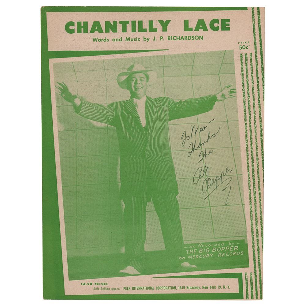 Exquisite sheet music booklet for ‘Chantilly Lace’ featuring an appropriately large image of the Big Bopper on the front, measuring 9 x 12, three pages, signed and inscribed in fountain pen, “To Wes—Thanks, The Big Bopper.” In fine condition. The Bopper’s greatest hit, ‘Chantilly Lace’ was the third most played song of 1958 and cemented his place in history as an early rock and roll star.