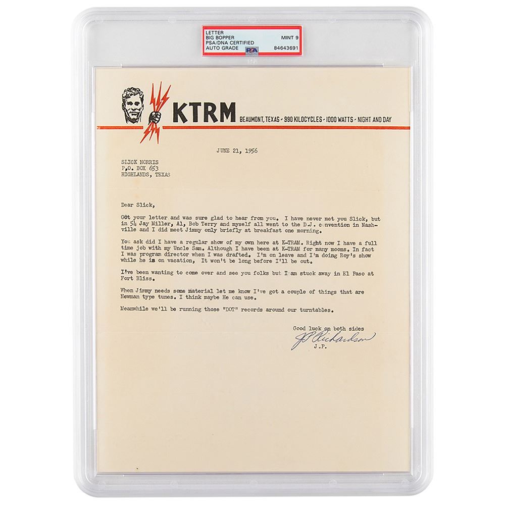 TLS signed “J. P. Richardson,†one page, 8.5 x 11, KTRM letterhead, June 21, 1956. Letter to important country music disc jockey Slick Norris, in full: "Got your letter and was sure glad to hear from you. I have never met you Slick, but in 54 Jay Miller, Al, Bob Terry and myself all went to the D.J. convention in Nashville and I did meet Jimmy only briefly at breakfast one morning. You ask did I have a regular show of my own here at K-TRAM. Right now I have a full time job with my Uncle Sam. Although I have been at K-TRAM for many moons. In fact I was program director when I was drafted. I'm on leave and I'm doing Roy's show while he is on vacation. It won't be long before I'll be out. I've been wanting to come over and see you folks but I am stuck away in El Paso at Fort Bliss. When Jimmy needs some material let me know I've got a couple of things that are Newman typed tunes. I think maybe He can use. Meanwhile we'll be running those 'DOT' records around our turntables." In fine condition, with faint toning from prior display. Encapsulated in a PSA/DNA authentication holder, grading the autograph as "MINT 9."