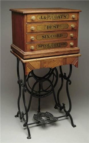 J. & P. COATS FOUR DRAWER SPOOL CABINET. Oak cabinet features original gold and black stenciled wood drawer fronts with original pulls. Back panel graphic is labeled " J&P Coats Best Six Cord". Rests atop treadle operated sewing table. SIZE: (Cabinet only) 21" w x 15-1/2" h x 15" d. CONDITION: Very good original finish; drawer front stencils worn in spots. 1-5775 PF