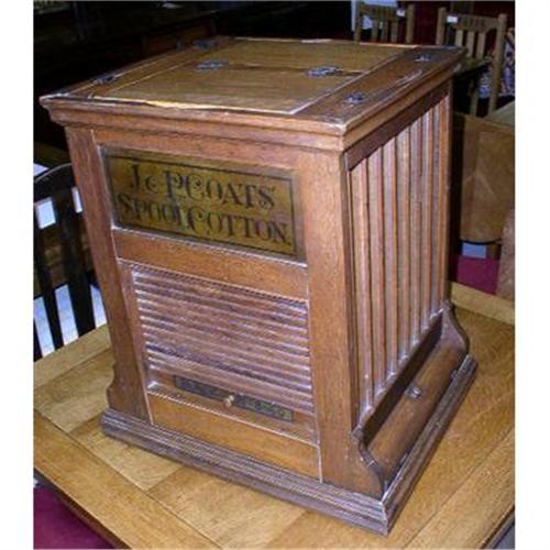 J.& P. COATS SPOOL CABINET. Tabletop oak display with original finish, twin tambour doors, wonderful stenciled lettering and fourteen glass column spool displays on a turntable base.