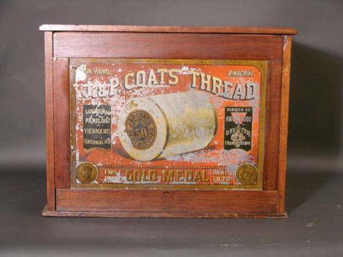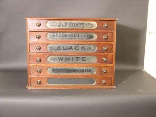 J.P. Coats spool cabinet - 6 drawer walnut/tin sign in back. 24.5" x 18.5" x 16.5" Good cond.