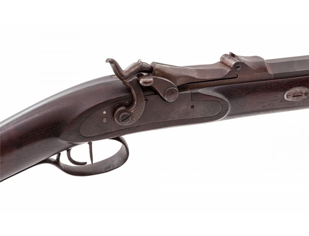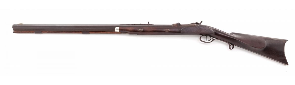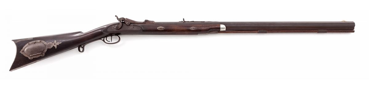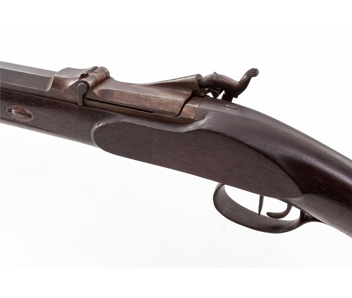 J.P. Gemmer Trapdoor Rifle, by Steve Lodding, #164148, .45-70 cal., 32'' medium-weight octagon barrel, blue and case hardened finish, custom walnut halfstock with cheekpiece, patchbox, and crescent buttplate; double set trigger, pewter forend cap, Gemmer-type rear sight and German silver Rocky Mountain type front blade, with hickory cleaning rod. Condition is excellent as purposely aged to look 150 years old. Stock shows only the lightest marks from handling. Double set trigger and action are crisp, bore is mirror bright. Steve Lodding is a master gunsmith and belongs to the Contemporary Long Rifle Assoc. His firearms have a one- to three-year wait after deposit, and when publicly displayed, many experts initially believed his rifles to be the genuine article. Est.: $3,000-$5,000. (Antique)