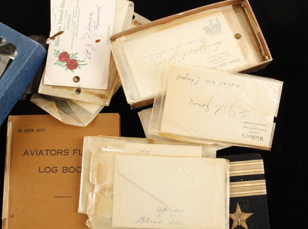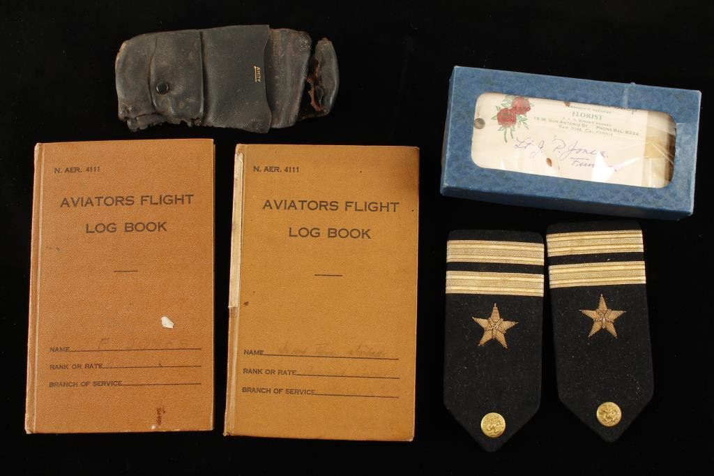 J.P. Jones naval aviators effects from WWII. 2 log books 1937-1943, his ensigns shoulder boards. Box of condolence cards to family on passing 1943- presumed service related. Stored in a box by family and passed down since WWII. Est.: $100-$200