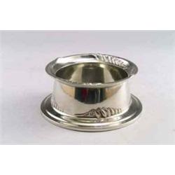 J.P. KAYSER, Krefeld Flaschenhalter, Zinn. Reliefiertes Blätter- und Blütendekor. Über rundem profiliertem Fuß ein eingezogenes flaches, zylindrisches Gefäß mit ausgestellter Mündung. Ø 15 cm. Bez.: Firmenmarke, Mod.Nr. 4704. Um 1905