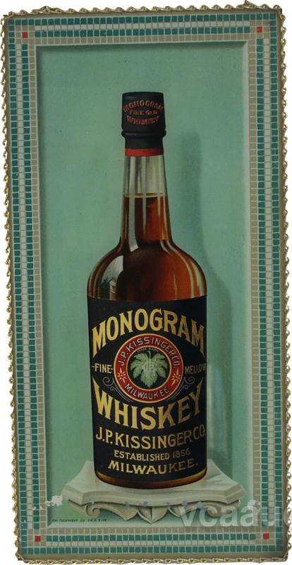 J.P. Kissinger Co. Milwaukee Reverse Glass Sign "Monogram Whiskey", all original w/ chain-link frame - 7" x 14"