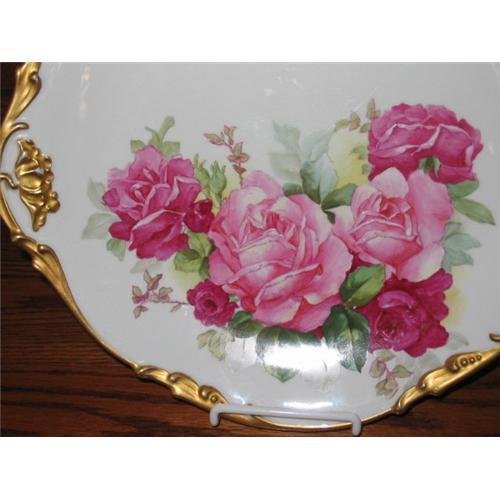 HERE IS A STUNNING LARGE HAND PAINTED FACTORY DECORATED J.P. LIMOGES PLACQUE/PLATE WITH GORGEOUS CLUSTERS OF LARGE PINK ROSES. THE ARTWORK ON THE ROSES IS SUPERB AS CAN BE SEEN IN THE IMAGES. THE CONDITION IS VERY GOOD WITH ONLY SOME VERY MINOR WEAR ON THE LAVISHLY GILDED GOLD. NO CHIPS, SCRATCHES, CRACKS, HAIRLINES OR REPAIRS. THIS PLACQUE HAS FACTORY DRILLED HOLES ON THE BACK WHICH WILL FACILITATE HANGING OR IT COULD BE DISPLAYED IN A CABINET. IT MEASURES 13.25" BY 12.5". JEAN POUYAT MARK 5 IN GREEN UNDERGLAZE AND MARK 8 OVERGLAZE DECORATING MARK.