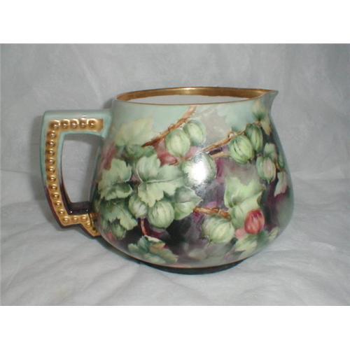 THIS SALE IS FOR A BEAUTIFUL J.P. LIMOGES LEMONADE OR CIDER PITCHER THAT WAS PRODUCED IN THE 1890'S AND IS IN VERY GOOD CONDITION WITH NO CHIPS, CRACKS, OR REPAIRS AS WELL AS THE HANDPAINTED DESIGN AND GOLD TRIM. THIS PITCHER MEASURES 6 3/4 IN. TALL AND 8 IN. WIDE FROM SPOUT TO HANDLE.