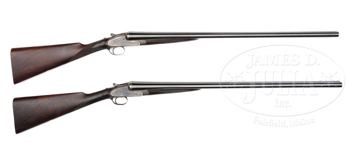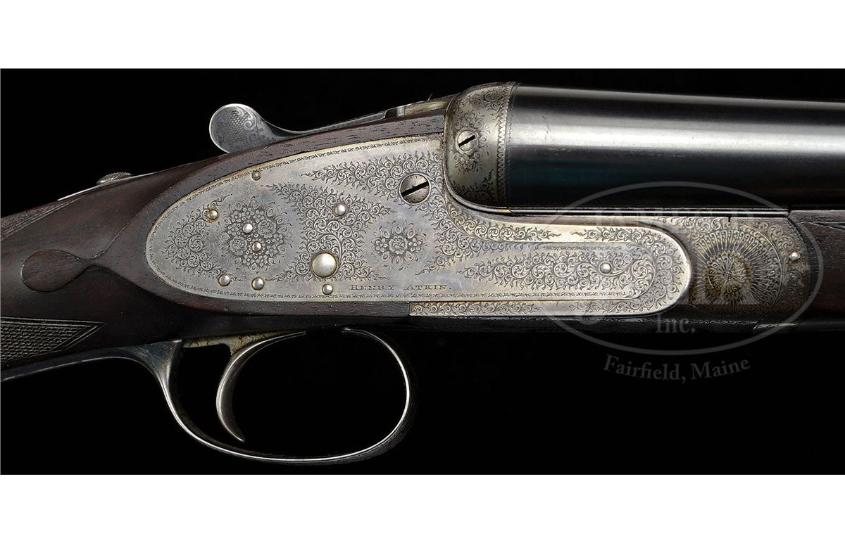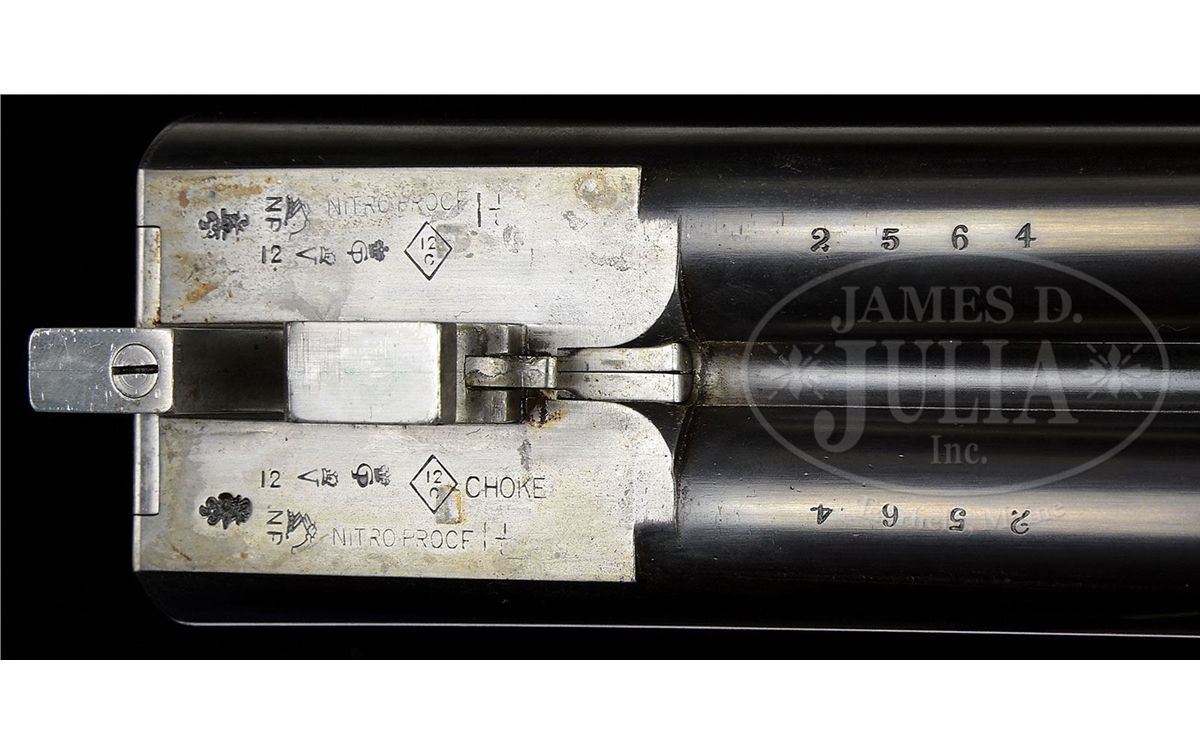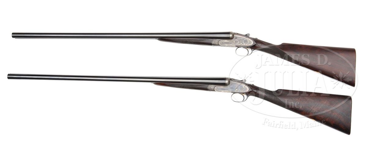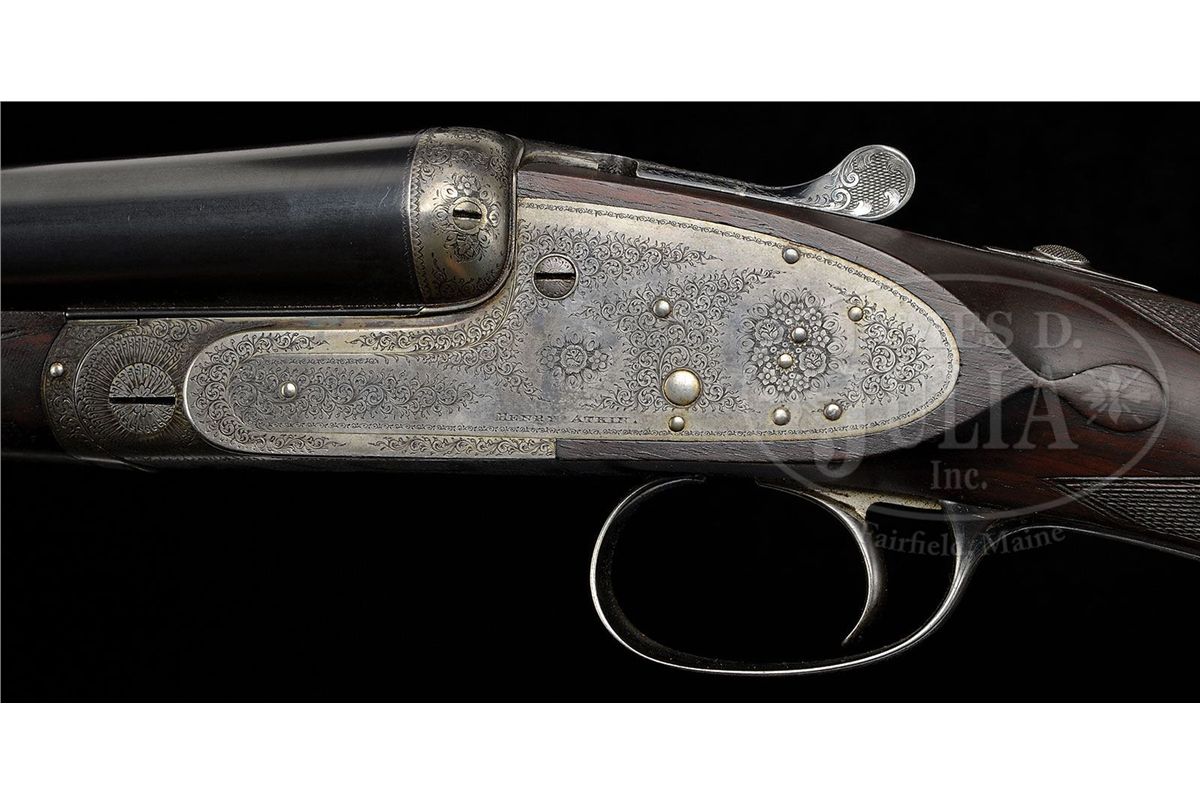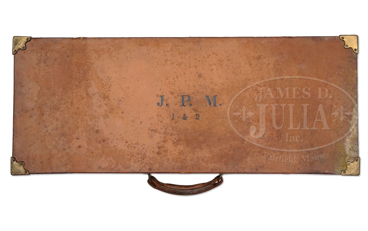 SN 2564/ 2565. (ca 1923) Cal. 12 ga. 2-1/2" Chambers. This fine pair of guns are gold inlaid "1" and "2" in the usual places. 30" Chopper lump bbls are engraved "Henry Atkin Ltd (From Purdey's) 88 Germyn St London. S. W." on narrow, swamped game rib. Bbl flats are stamped with London nitro proofs for 1-1/8 oz of shot. SNs are stamped on bottoms of bbls. Case hardened, Purdey type, self-opening actions are built on Henry Atkin's adaptation of Beasley's famous patent, whereby the internal parts were shaped so as to make the guns easier to close than in "other" self-openers. Actions feature automatic safeties (SAFE inlaid in gold), bushed strikers, and single non-selective triggers. Actions are engraved with exceptionally well cut, small, shaded scroll surrounding rose bouquets, in classic British "best" style. "Henry Atkin" is engraved on the bottom of each lockplate, and on bottom of actions over "From Purdey's". Trigger guards are engraved with open, flowing scroll, and with SNs on short tangs. Gun no. "1" has lightly veined European walnut. Gun no. "2" is dark, with finely marbled and nicely figured European walnut. Both guns have straight grip buttstocks measuring 14-3/4" over coarsely checkered wood butts, and feature drop points, classic point pattern checkering with mullered borders, and gold ovals on toe lines engraved with monogram, "JPM". Matching splinter ejector forends have Anson releases. Gun no. "1": Bore diameter: left-.729, right -.729. Bore restrictions: left -.022 (Mod), right -.006 (IC). Wall thickness: left -.025, right -.025. Drop at heel: 2-1/4", drop at comb: 1-1/2". Weight: 6 lbs. 9 oz. LOP: 14-3/4". Gun no. "2": Bore diameter: left-.732, right -.733. Bore restrictions: left -.020 (Mod), right -.004 (IC). Wall thickness: left -.020, right -.016. Drop at heel: 2-1/4", drop at comb: 1-1/2". Weight: 6 lbs. 8 oz. LOP: 14-3/4". Makers oak and leather two gun case with brass corners is embossed "J. P. M." on top. Case retains its canvas outer cover with leather trim and extra pockets, which also has central leather tag embossed "J. P. M." and "1 & 2". Interior of case is lined in scarlet cloth, and has black leather, gold embossed Henry Atkin label on lid, with secondary label tacked in which instructs: "NOTE. To insure proper working it is essential, when opening this gun, that the barrels should be dropped smartly to their fullest extent." Case contains high quality long 2-pc ebony and brass cleaning rod (short handled) with mop, jag, and Turks head, a black morocco leather wallet containing pull through cleaning equipment, one snap cap marked "Henry Atkin London", and three marked "J & W Hawksley", along with a brass topped tin with green label marked "Special cleaning and lubricating oil" with Henry Atkin name and address. PROVENANCE: From the family of banker and philanthropist, J. P. Morgan, Jr. with letter explaining the order of family ownership. Henry S. Morgan Jr. Estate Collection. CONDITION: Fine. Bbls retain nearly all of an old high quality re-blue with slight silvering at muzzles and on ribs. Engraving is thin. Action of gun no. "1" retains a considerable amount of its orig case hardening color, mostly where protected, but is generally an overall pewter gray. Lockplates have most of their color, considerably thinned. Gun no. "2" retains a bit more color on action, and perhaps 70% on lockplates. Top levers and trigger guards of both guns retain a considerable amount of their orig blue. Gun no. "1" was re-stocked, most likely by the factory, as shaping and quality are of the first order, with only a few minor marks. Checkering is slightly worn. Stock oval reset, engraving a bit thin. Gun no. "2" retains its orig stock, refinished over a number of light and heavy marks, showing considerable wear at butt. Checkering is considerably worn and dirty. There is an incipient crack behind top tang. Both forends have slightly worn checkering. Bores are excellent, with evidence of dent removal on top of right bbl of gun no. "1", and bottom of left bbl of gun no. "2". Actions are tight. Bbls of gun no. "1" are on face. Gun no. "2" has right bbl slightly off face. Right ejector trips intermittently on gun no. "1", and ejectors are very slightly out of time on gun no. "2". Triggers work. Guns have been in storage for a very long time and can do with a good cleaning. Case leather is fine with considerable staining. The outer cover has considerable mold and mildew from poor storage. Some straps of outer cover are detached and missing. Straps and handle of case are good. Interior cloth is good, with considerable marks and compressions from contact with guns, and with some light insect damage and considerable mildew. Accessories are fine. Label is mildewed. Secondary label is soiled, oil soaked and foxed. Case should clean up nicely. 4-49128 MGM182