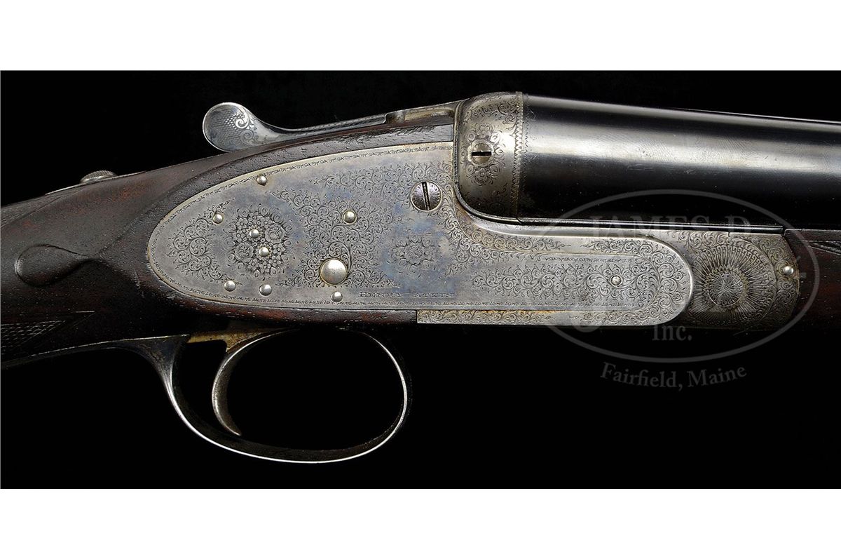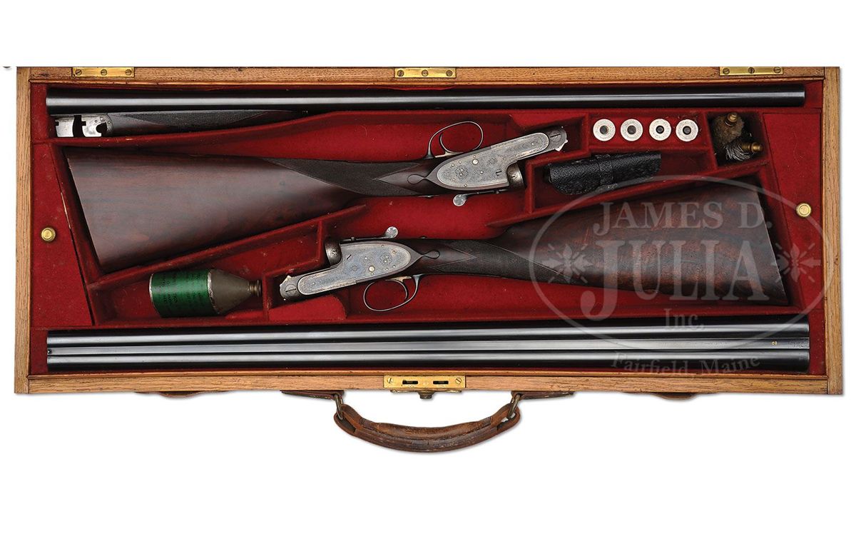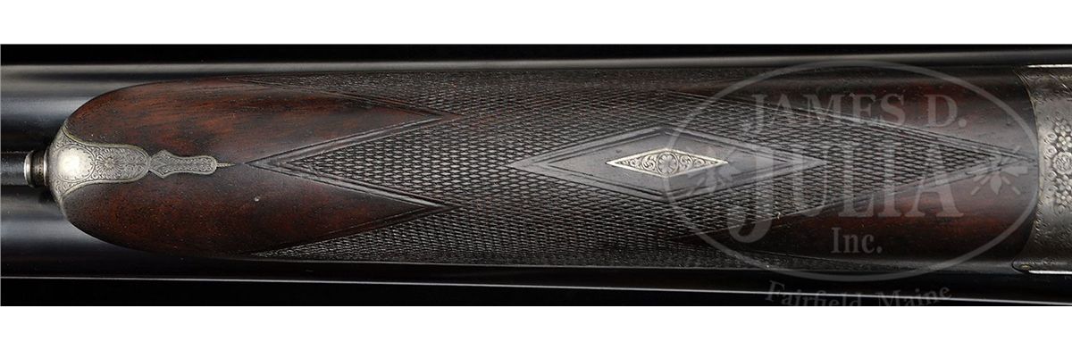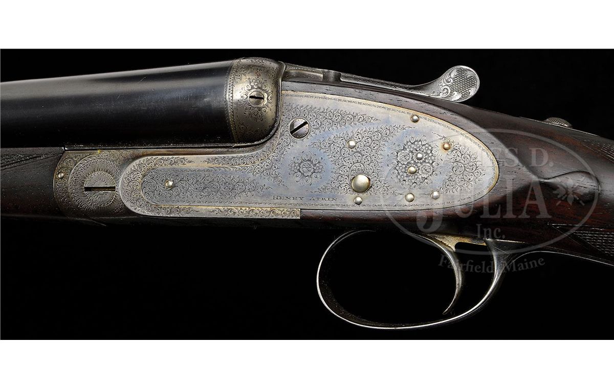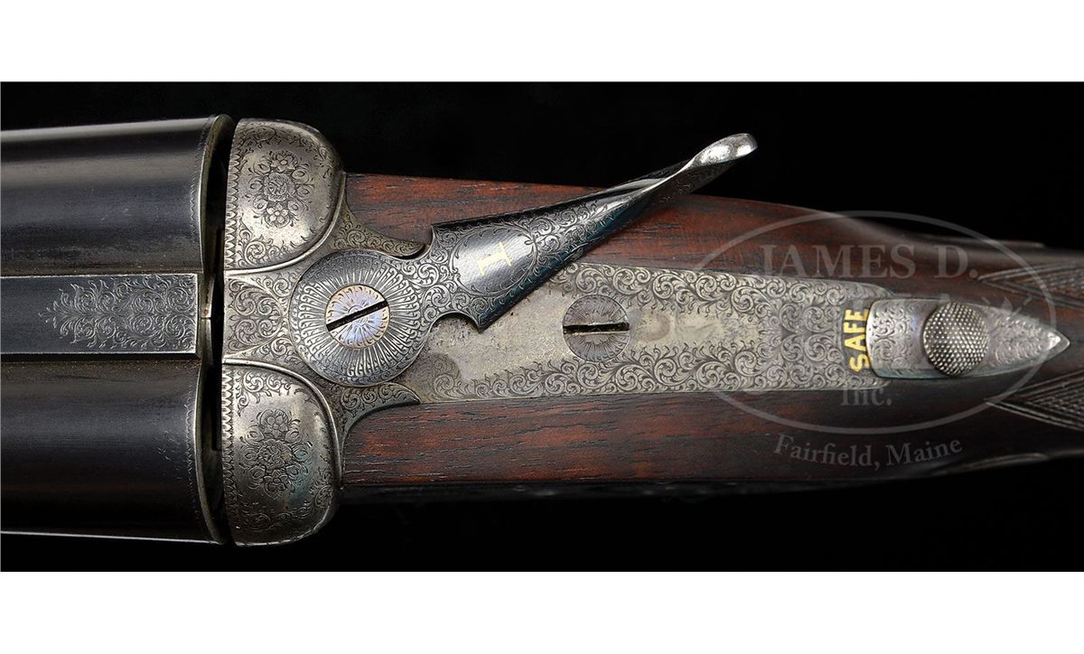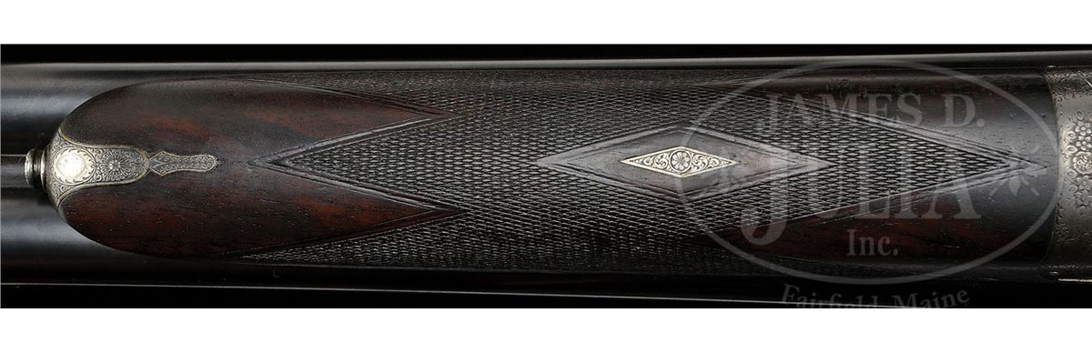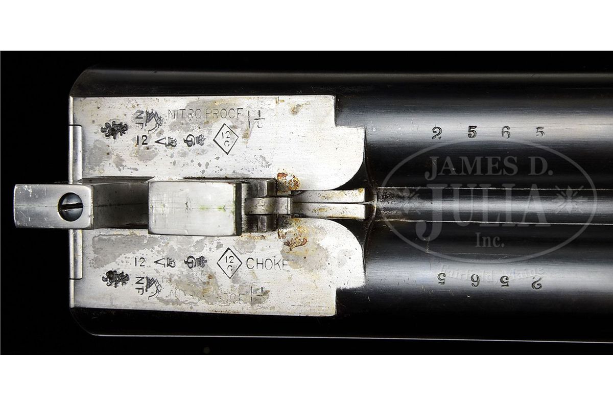 SN 2564/ 2565. (ca 1923) Cal. 12 ga. 2-1/2" Chambers. This fine pair of guns are gold inlaid "1" and "2" in the usual places. 30" Chopper lump bbls are engraved "Henry Atkin Ltd (From Purdey's) 88 Germyn St London. S. W." on narrow, swamped game rib. Bbl flats are stamped with London nitro proofs for 1-1/8 oz of shot. SNs are stamped on bottoms of bbls. Case hardened, Purdey type, self-opening actions are built on Henry Atkin's adaptation of Beasley's famous patent, whereby the internal parts were shaped so as to make the guns easier to close than in "other" self-openers. Actions feature automatic safeties (SAFE inlaid in gold), bushed strikers, and single non-selective triggers. Actions are engraved with exceptionally well cut, small, shaded scroll surrounding rose bouquets, in classic British "best" style. "Henry Atkin" is engraved on the bottom of each lockplate, and on bottom of actions over "From Purdey's". Trigger guards are engraved with open, flowing scroll, and with SNs on short tangs. Gun no. "1" has lightly veined European walnut. Gun no. "2" is dark, with finely marbled and nicely figured European walnut. Both guns have straight grip buttstocks measuring 14-3/4" over coarsely checkered wood butts, and feature drop points, classic point pattern checkering with mullered borders, and gold ovals on toe lines engraved with monogram, "JPM". Matching splinter ejector forends have Anson releases. Gun no. "1": Bore diameter: left-.729, right -.729. Bore restrictions: left -.022 (Mod), right -.006 (IC). Wall thickness: left -.025, right -.025. Drop at heel: 2-1/4", drop at comb: 1-1/2". Weight: 6 lbs. 9 oz. LOP: 14-3/4". Gun no. "2": Bore diameter: left-.732, right -.733. Bore restrictions: left -.020 (Mod), right -.004 (IC). Wall thickness: left -.020, right -.016. Drop at heel: 2-1/4", drop at comb: 1-1/2". Weight: 6 lbs. 8 oz. LOP: 14-3/4". Makers oak and leather two gun case with brass corners is embossed "J. P. M." on top. Case retains its canvas outer cover with leather trim and extra pockets, which also has central leather tag embossed "J. P. M." and "1 & 2". Interior of case is lined in scarlet cloth, and has black leather, gold embossed Henry Atkin label on lid, with secondary label tacked in which instructs: "NOTE. To insure proper working it is essential, when opening this gun, that the barrels should be dropped smartly to their fullest extent." Case contains high quality long 2-pc ebony and brass cleaning rod (short handled) with mop, jag, and Turks head, a black morocco leather wallet containing pull through cleaning equipment, one snap cap marked "Henry Atkin London", and three marked "J & W Hawksley", along with a brass topped tin with green label marked "Special cleaning and lubricating oil" with Henry Atkin name and address. PROVENANCE: From the family of banker and philanthropist, J. P. Morgan, Jr. with letter explaining the order of family ownership. Henry S. Morgan Jr. Estate Collection. CONDITION: Fine. Bbls retain nearly all of an old high quality re-blue with slight silvering at muzzles and on ribs. Engraving is thin. Action of gun no. "1" retains a considerable amount of its orig case hardening color, mostly where protected, but is generally an overall pewter gray. Lockplates have most of their color, considerably thinned. Gun no. "2" retains a bit more color on action, and perhaps 70% on lockplates. Top levers and trigger guards of both guns retain a considerable amount of their orig blue. Gun no. "1" was re-stocked, most likely by the factory, as shaping and quality are of the first order, with only a few minor marks. Checkering is slightly worn. Stock oval reset, engraving a bit thin. Gun no. "2" retains its orig stock, refinished over a number of light and heavy marks, showing considerable wear at butt. Checkering is considerably worn and dirty. There is an incipient crack behind top tang. Both forends have slightly worn checkering. Bores are excellent, with evidence of dent removal on top of right bbl of gun no. "1", and bottom of left bbl of gun no. "2". Actions are tight. Bbls of gun no. "1" are on face. Gun no. "2" has right bbl slightly off face. Right ejector trips intermittently on gun no. "1", and ejectors are very slightly out of time on gun no. "2". Triggers work. Guns have been in storage for a very long time and can do with a good cleaning. Case leather is fine with considerable staining. The outer cover has considerable mold and mildew from poor storage. Some straps of outer cover are detached and missing. Straps and handle of case are good. Interior cloth is good, with considerable marks and compressions from contact with guns, and with some light insect damage and considerable mildew. Accessories are fine. Label is mildewed. Secondary label is soiled, oil soaked and foxed. Case should clean up nicely. 4-49128 MGM182