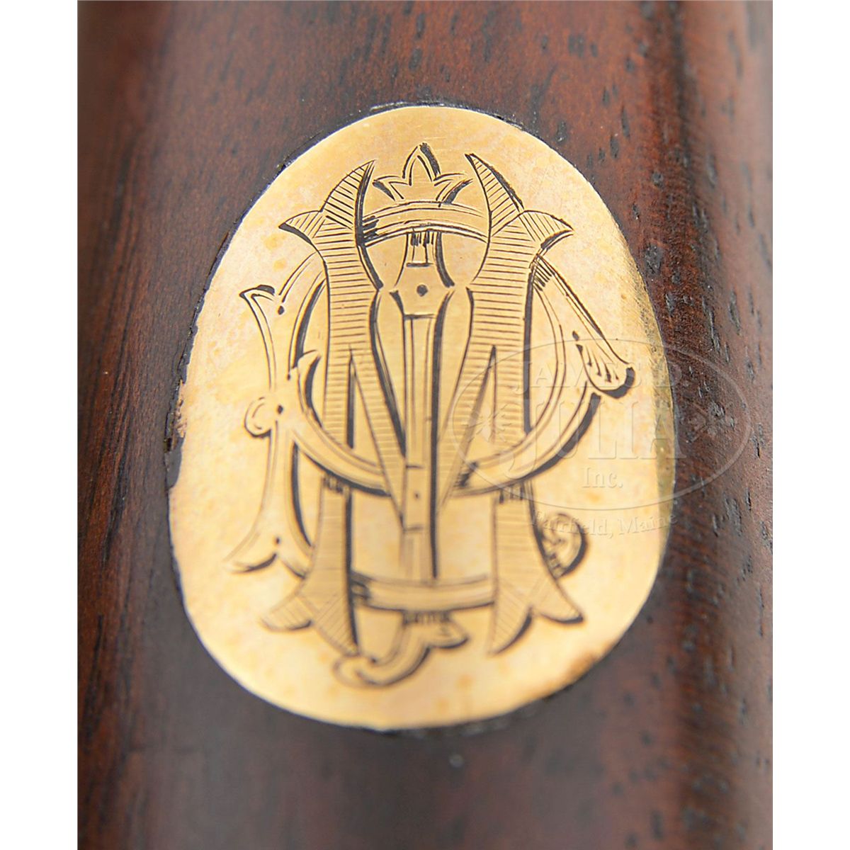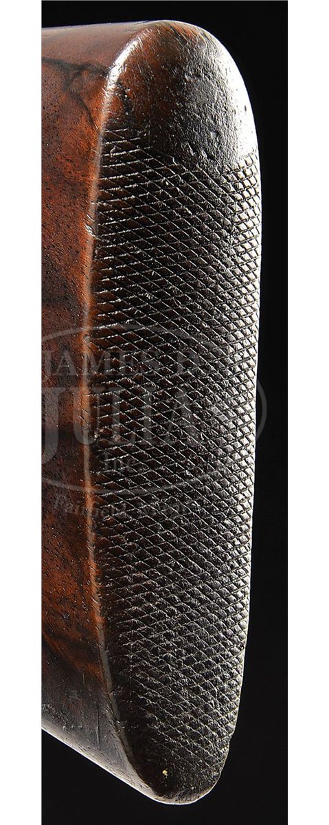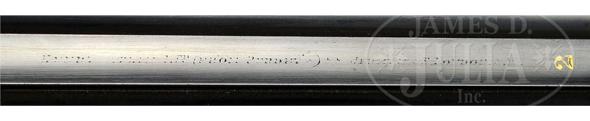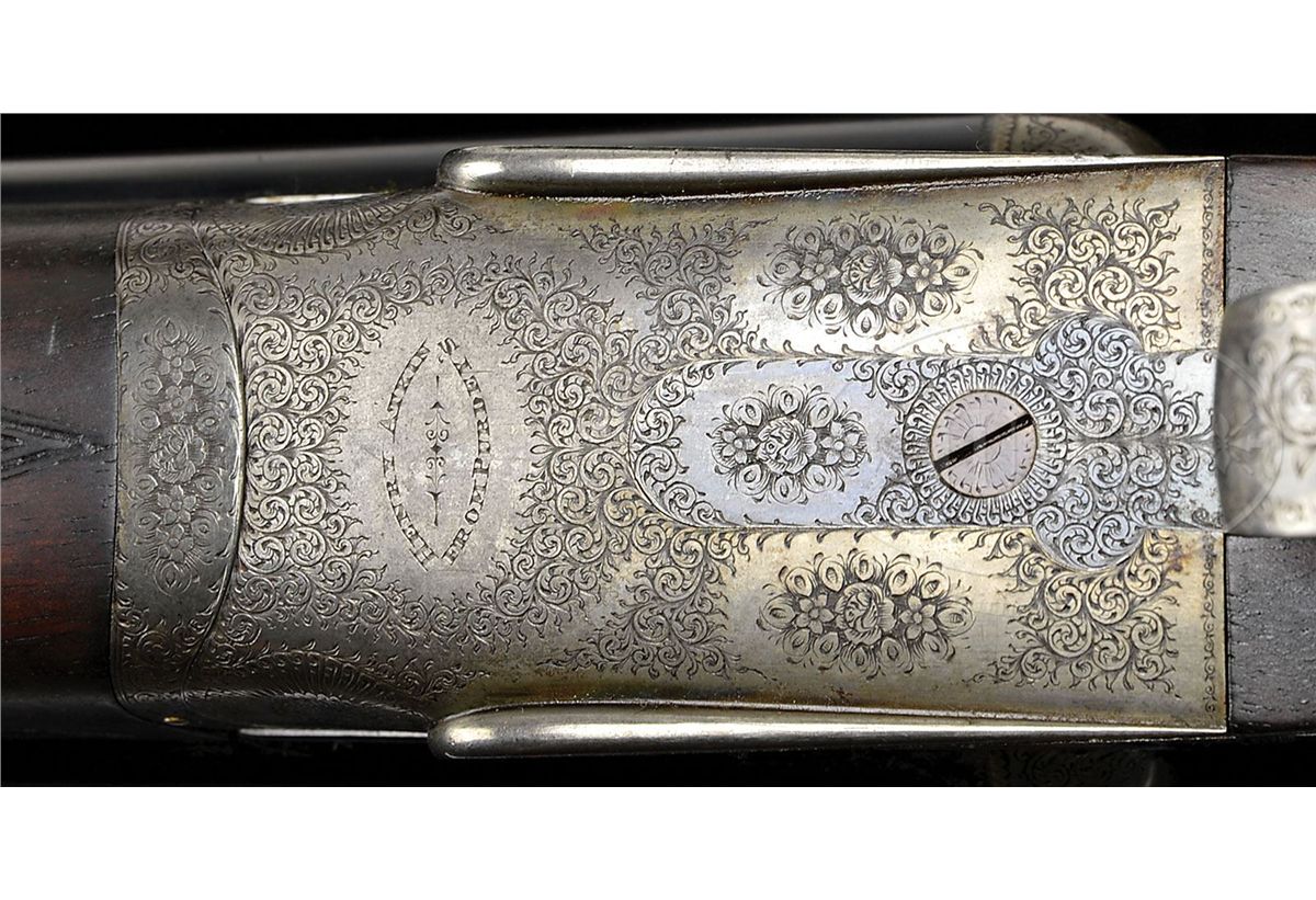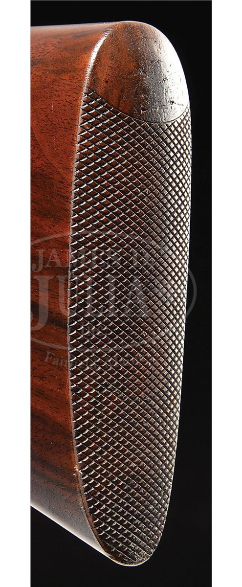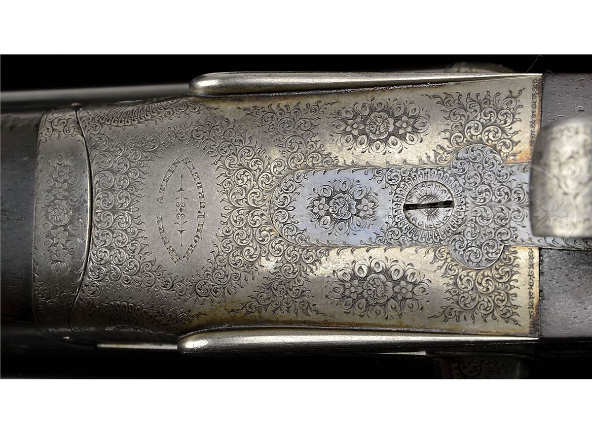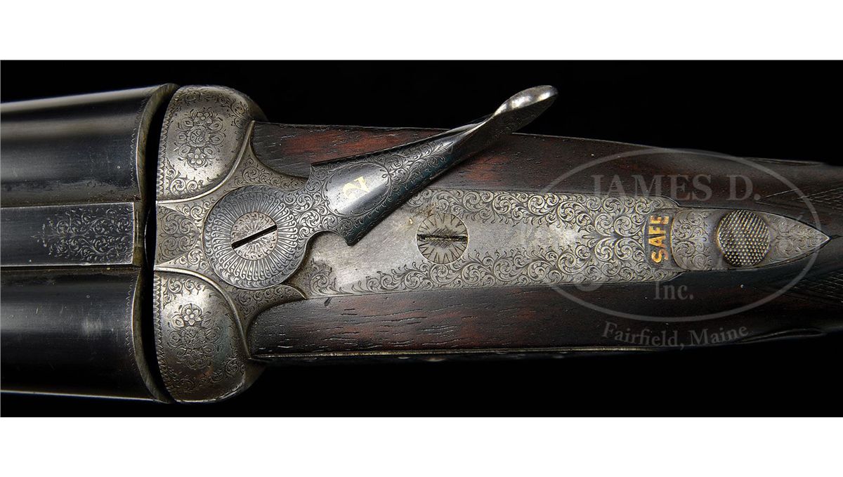 SN 2564/ 2565. (ca 1923) Cal. 12 ga. 2-1/2" Chambers. This fine pair of guns are gold inlaid "1" and "2" in the usual places. 30" Chopper lump bbls are engraved "Henry Atkin Ltd (From Purdey's) 88 Germyn St London. S. W." on narrow, swamped game rib. Bbl flats are stamped with London nitro proofs for 1-1/8 oz of shot. SNs are stamped on bottoms of bbls. Case hardened, Purdey type, self-opening actions are built on Henry Atkin's adaptation of Beasley's famous patent, whereby the internal parts were shaped so as to make the guns easier to close than in "other" self-openers. Actions feature automatic safeties (SAFE inlaid in gold), bushed strikers, and single non-selective triggers. Actions are engraved with exceptionally well cut, small, shaded scroll surrounding rose bouquets, in classic British "best" style. "Henry Atkin" is engraved on the bottom of each lockplate, and on bottom of actions over "From Purdey's". Trigger guards are engraved with open, flowing scroll, and with SNs on short tangs. Gun no. "1" has lightly veined European walnut. Gun no. "2" is dark, with finely marbled and nicely figured European walnut. Both guns have straight grip buttstocks measuring 14-3/4" over coarsely checkered wood butts, and feature drop points, classic point pattern checkering with mullered borders, and gold ovals on toe lines engraved with monogram, "JPM". Matching splinter ejector forends have Anson releases. Gun no. "1": Bore diameter: left-.729, right -.729. Bore restrictions: left -.022 (Mod), right -.006 (IC). Wall thickness: left -.025, right -.025. Drop at heel: 2-1/4", drop at comb: 1-1/2". Weight: 6 lbs. 9 oz. LOP: 14-3/4". Gun no. "2": Bore diameter: left-.732, right -.733. Bore restrictions: left -.020 (Mod), right -.004 (IC). Wall thickness: left -.020, right -.016. Drop at heel: 2-1/4", drop at comb: 1-1/2". Weight: 6 lbs. 8 oz. LOP: 14-3/4". Makers oak and leather two gun case with brass corners is embossed "J. P. M." on top. Case retains its canvas outer cover with leather trim and extra pockets, which also has central leather tag embossed "J. P. M." and "1 & 2". Interior of case is lined in scarlet cloth, and has black leather, gold embossed Henry Atkin label on lid, with secondary label tacked in which instructs: "NOTE. To insure proper working it is essential, when opening this gun, that the barrels should be dropped smartly to their fullest extent." Case contains high quality long 2-pc ebony and brass cleaning rod (short handled) with mop, jag, and Turks head, a black morocco leather wallet containing pull through cleaning equipment, one snap cap marked "Henry Atkin London", and three marked "J & W Hawksley", along with a brass topped tin with green label marked "Special cleaning and lubricating oil" with Henry Atkin name and address. PROVENANCE: From the family of banker and philanthropist, J. P. Morgan, Jr. with letter explaining the order of family ownership. Henry S. Morgan Jr. Estate Collection. CONDITION: Fine. Bbls retain nearly all of an old high quality re-blue with slight silvering at muzzles and on ribs. Engraving is thin. Action of gun no. "1" retains a considerable amount of its orig case hardening color, mostly where protected, but is generally an overall pewter gray. Lockplates have most of their color, considerably thinned. Gun no. "2" retains a bit more color on action, and perhaps 70% on lockplates. Top levers and trigger guards of both guns retain a considerable amount of their orig blue. Gun no. "1" was re-stocked, most likely by the factory, as shaping and quality are of the first order, with only a few minor marks. Checkering is slightly worn. Stock oval reset, engraving a bit thin. Gun no. "2" retains its orig stock, refinished over a number of light and heavy marks, showing considerable wear at butt. Checkering is considerably worn and dirty. There is an incipient crack behind top tang. Both forends have slightly worn checkering. Bores are excellent, with evidence of dent removal on top of right bbl of gun no. "1", and bottom of left bbl of gun no. "2". Actions are tight. Bbls of gun no. "1" are on face. Gun no. "2" has right bbl slightly off face. Right ejector trips intermittently on gun no. "1", and ejectors are very slightly out of time on gun no. "2". Triggers work. Guns have been in storage for a very long time and can do with a good cleaning. Case leather is fine with considerable staining. The outer cover has considerable mold and mildew from poor storage. Some straps of outer cover are detached and missing. Straps and handle of case are good. Interior cloth is good, with considerable marks and compressions from contact with guns, and with some light insect damage and considerable mildew. Accessories are fine. Label is mildewed. Secondary label is soiled, oil soaked and foxed. Case should clean up nicely. 4-49128 MGM182
