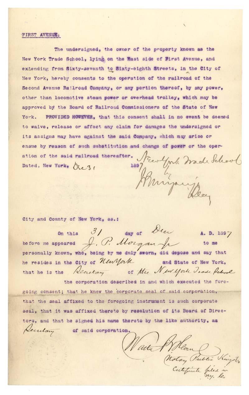 Typed Document Signed. New York. December 31, 1897. 1 pp. 8" x 13". Legal document giving consent to the to Second Avenue Railroad Company to the New York Trade School signed “J.P. Morgan Jr.” It reads, in part: “The undersigned, the owner of the property known as the New York Trade School, lying on the East side of First Avenue, and extending from sixty-seventh to sixty-eighth Streets, in the City of “New York, hereby consents to the operation of the railroad of the Second Avenue Railroad Company or any portion thereof, by any power, other than locomotive steam power or overhead trolley, which may be approved by the Board of Railroad Commissioners the State of New York. PROVIDED HOWEVER, that this consent shall in no event be deemed to waive, release or affect any claim for damages the undersigned or its assigns may have against the said Company, which may arise or ensue by reason of such substitution and change of power or the operation of the said railroad...” The New York Trade School was originally called the Metropolitan Museum of Art. In 1881 it was renamed the New York Trade School to more precisely reflect its curriculum (after the art education program is moved to a separate school). Five years before this document was signed, Morgan’s father had offered the school a sizeable endowment. Over the next 60 years it gained a reputation as the nation’s leading trade school for American young men and the model upon which other trade schools are founded. With impressed seal and minor age wear to bottom third. Mostly Fine. An interesting Railroad, Art School & Morgan association with a scarce JP Morgan, Jr. signature.