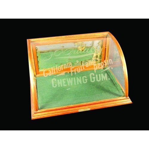 J.P. Primleys Chewing Gum Showcase Curved glass, Oak. Mirror needs replaced, otherwise good condition. 18 1/2 x 9 1/2 x 12 1/4.