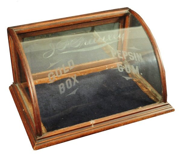 J.P. Priwley's Gold Box Pepsin Gum Display Case. Measures 18 1/2" wide x 12 1/2" deep x 9 1/2" tall.