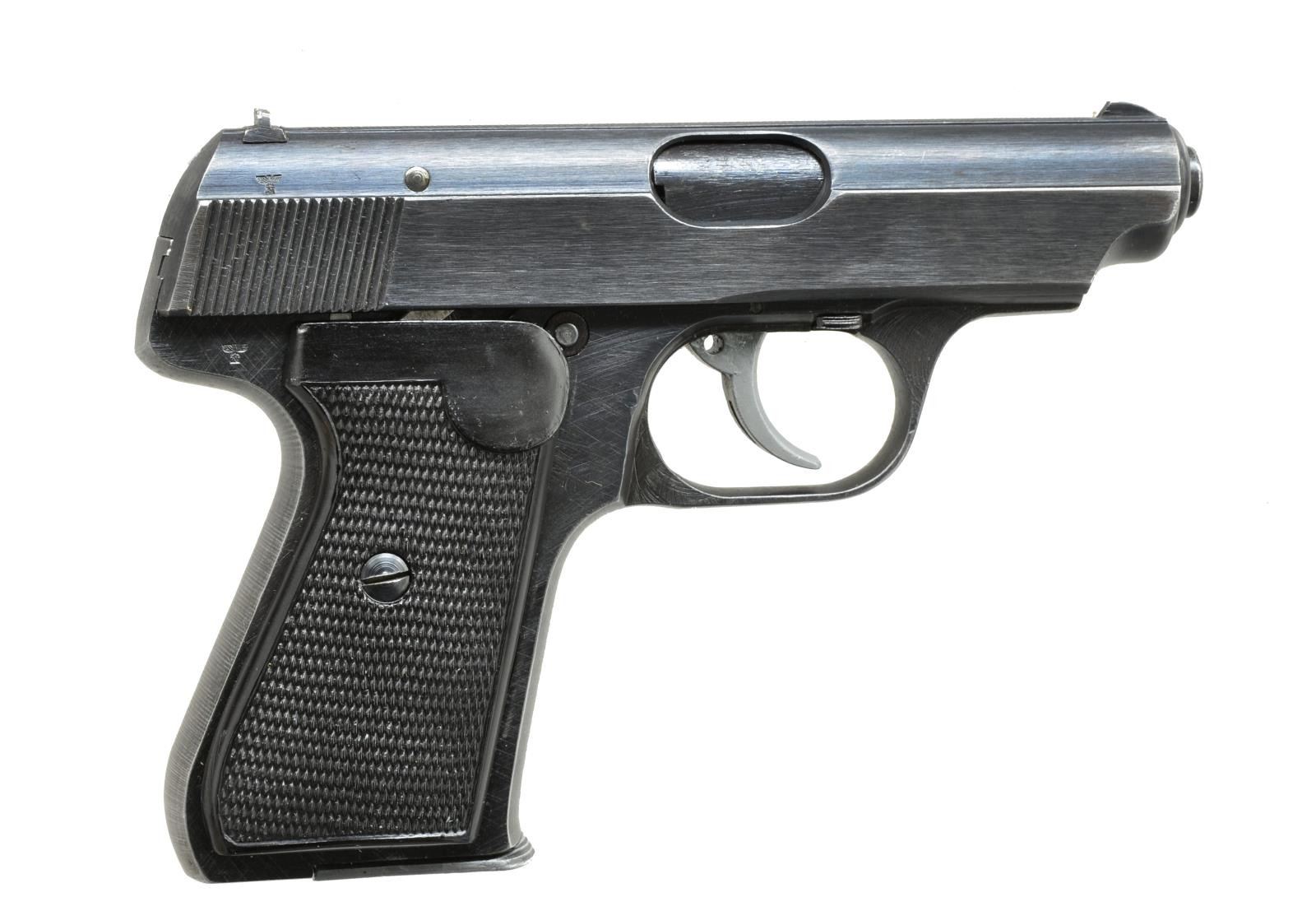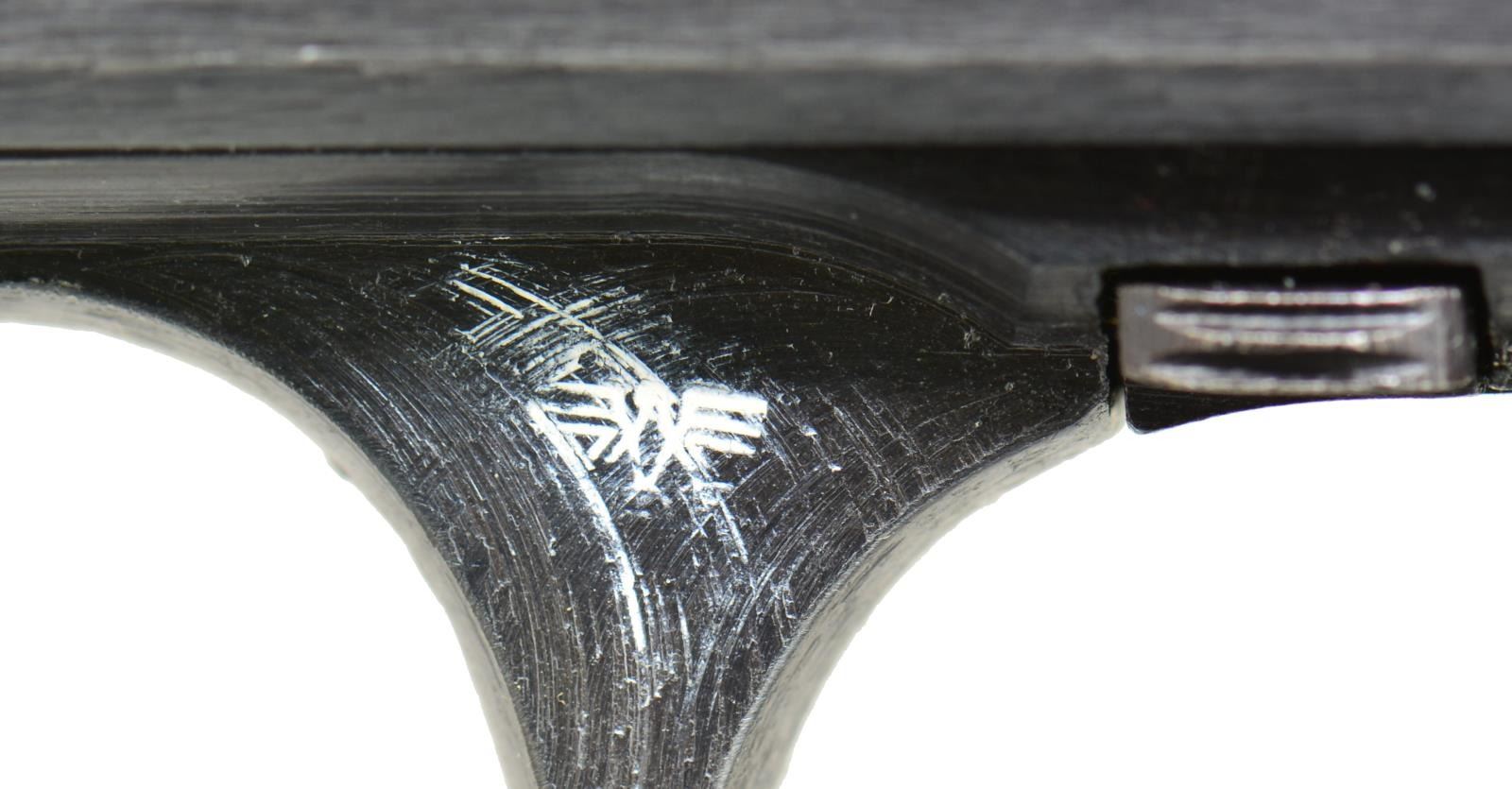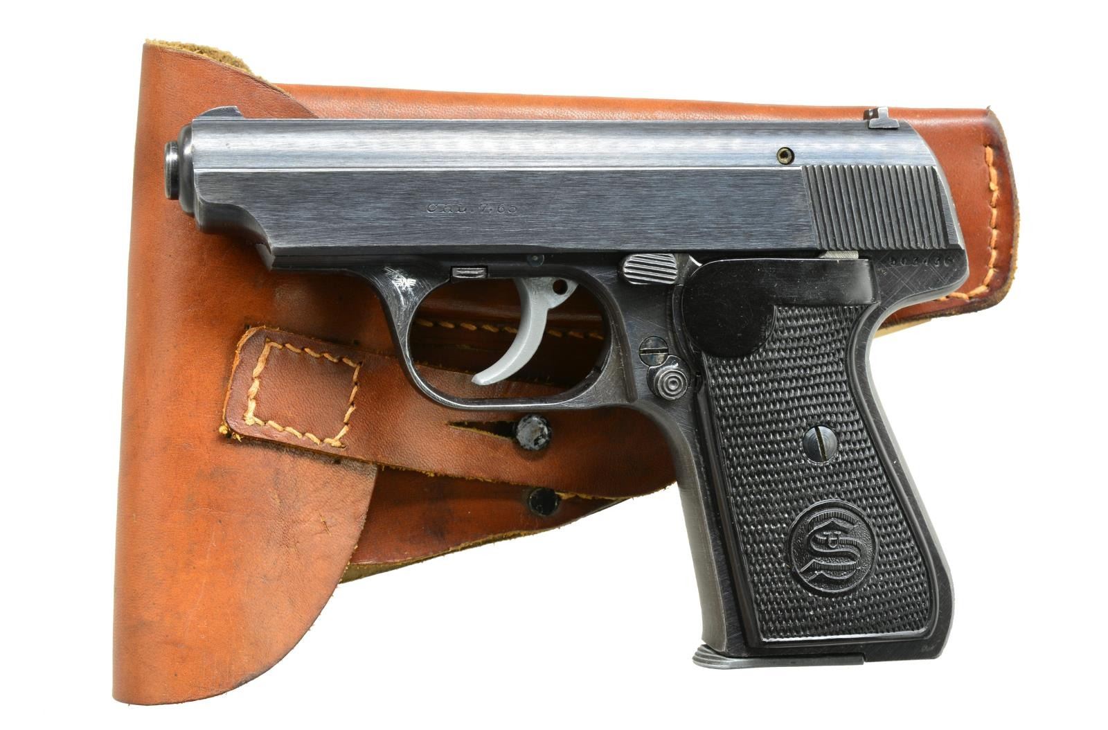 Cal. 7.65mm. S# 503436. Bbl. 3 1/2”. Wartime polish military blue finish. Matted rib slide w/ “Cal 7.65mm” marking. Eagle “N” proofed frame, bbl. & slide. Eagle “F” police proof on left trigger web. Cocking release lever. No manual safety. MAGS: 2 TOTAL: 1-8 rd. intertwined “SS”, 1 unmarked 8 rd. UNATTACHED ACCESSORIES: brown leather German proofed, otherwise unmarked, holster. CONDITION: overall very fine w/ light high edge & muzzle holster wear. Lightly thinning finish on front & back straps. Grips show light wear & handling marks. Near excellent bright bore w/ nice rifling. Very fine holster w/ only a few minor handling marks. (20-3244/ZAL). CURIO. $800-1,200.
