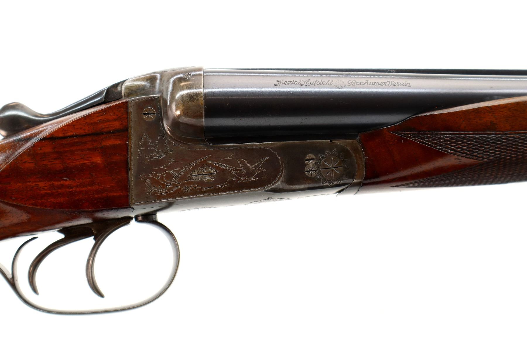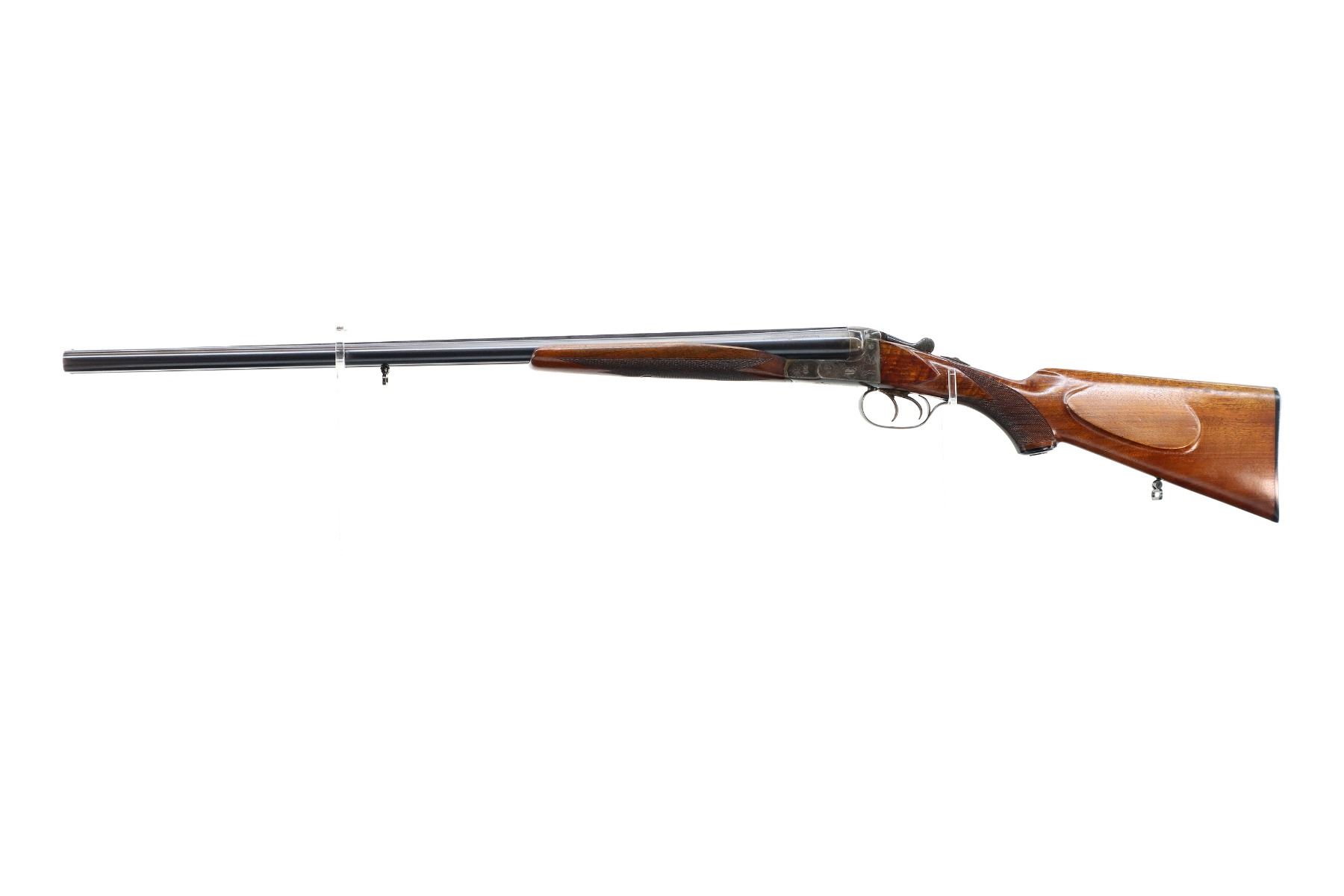 Main Description: Silver bead, blued barrels with raised rib, colour case hardened engraved receiver, automatic safety, extractor, double triggers. Two piece wood stocks, checkered Beavertail forearm and pistol grip, small crack behind upper tang, cheek rest, grooved black polymer butt plate, grip cap, sling swivels