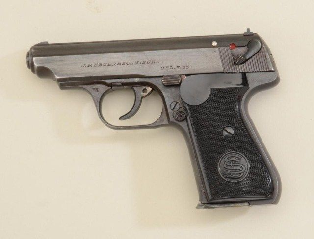 J.P. Sauer Model 38-H DA semi-auto pistol, police accepted Eagle C acceptance marked, 7.65mm cal., 3-1/2” barrel, mat blue finish, checkered black plastic grips, #382461 with tan leather flap holster and extra magazine.This gun is in overall very good to fine condition with a very good + bore, action, markings and grips showing a crack to the right grip from the screw to the back of the grip; the holster overall good. Est.:$400-$800.