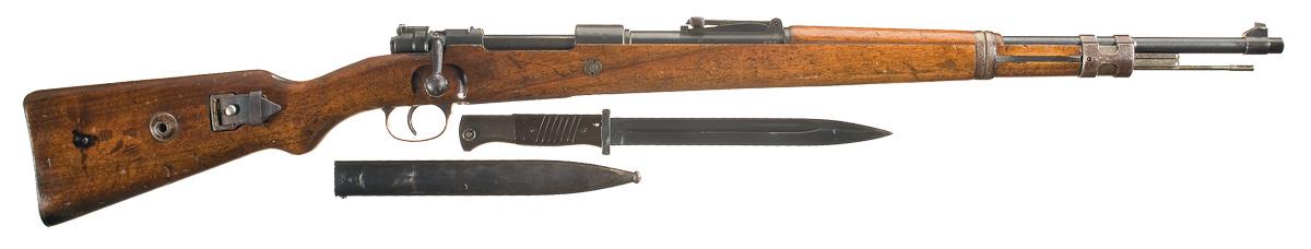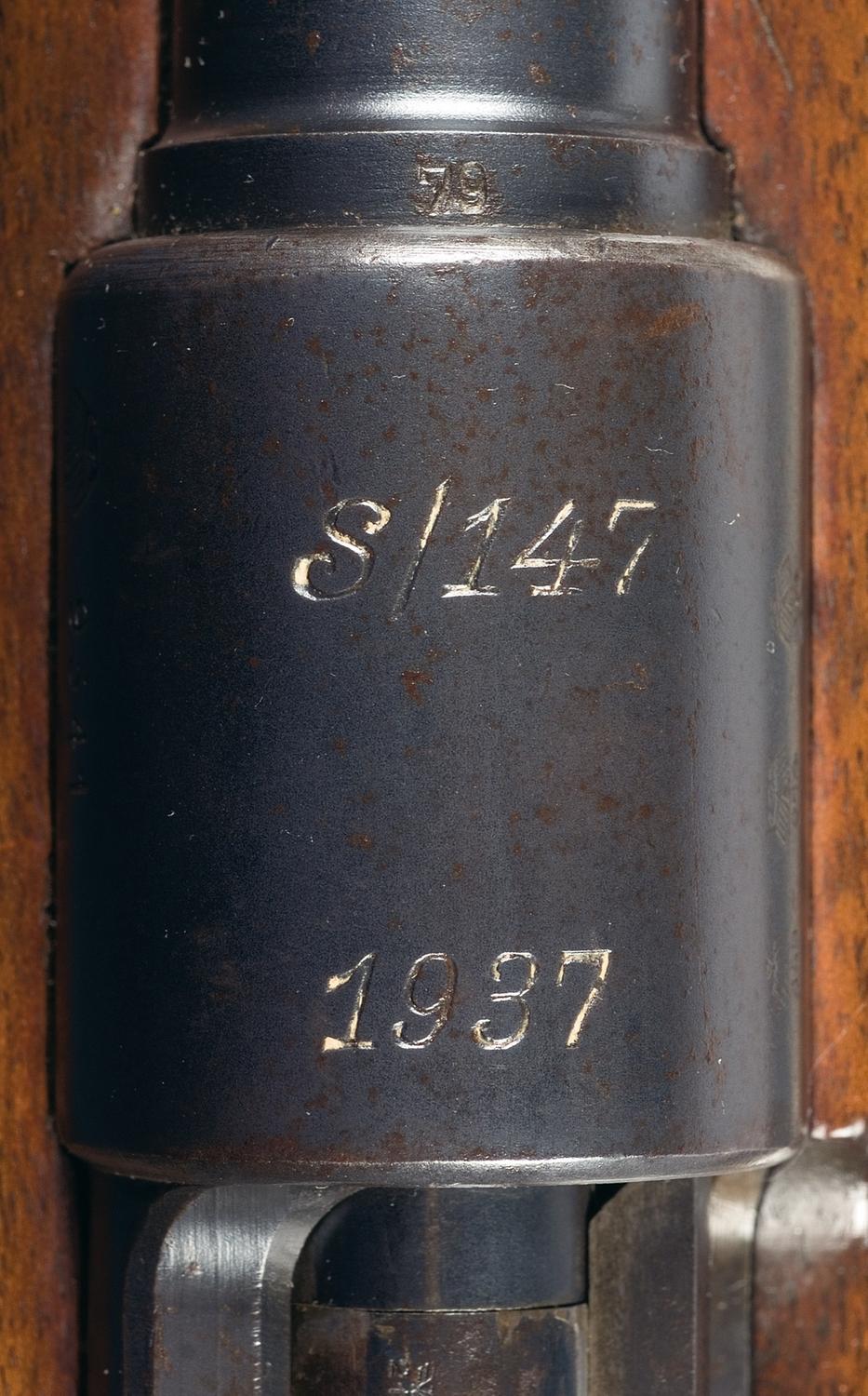 Blade front and tangent rear sights, with "eagle/ 359" proofs on the barrel and receiver ring and "droop wing eagle/ 214" proofs on the ring along with the "S/147" over "1937" markings. Machined components, with the safety and cocking piece unnumbered and the rest matching. Smooth stock, with Heer stamp, "eagle/ 214" proofs and a flat butt. With a brown leather sling and a 38 dated J. Schmidt bayonet with 10" blade, ribbed grip and matching numbered sheath.
