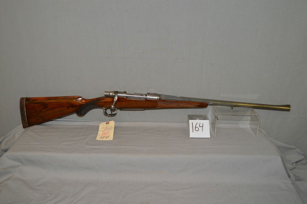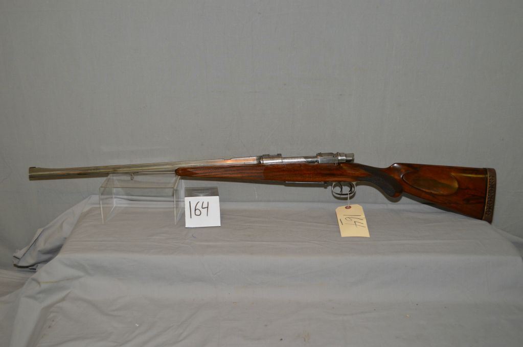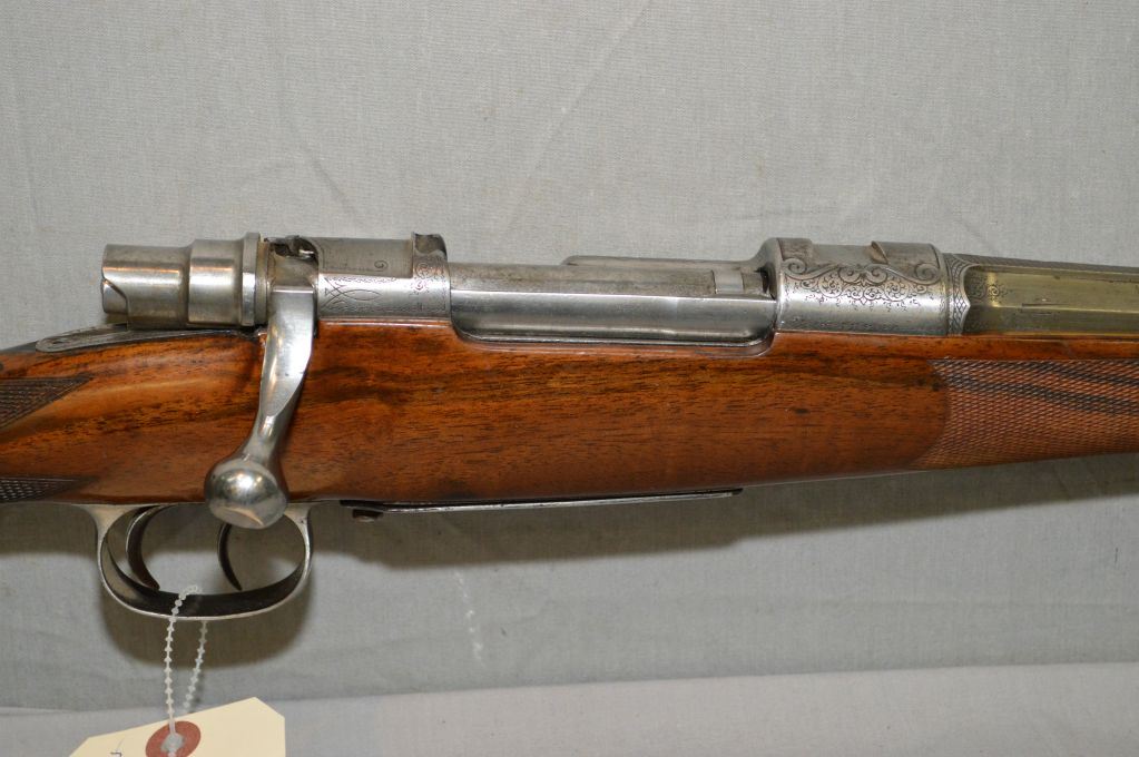 J.P. Sauer & Sohn Model Mauser Action Gun Stamped .7 Merco but caliber unknown, check for youself Bolt Action Rifle w/ 22" bbl [ part octagon, part round barrel w/ matted rib, missing back barrel sight & barrel band sight, engraved receiver & part of the barrel, also trigger guard and fore plate, double set trigger, deluxe wood pistol grip stock & forend w/ White Line recoil pad, missing back sling stud ] Ser # 2128