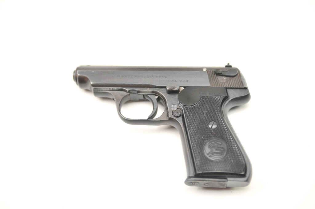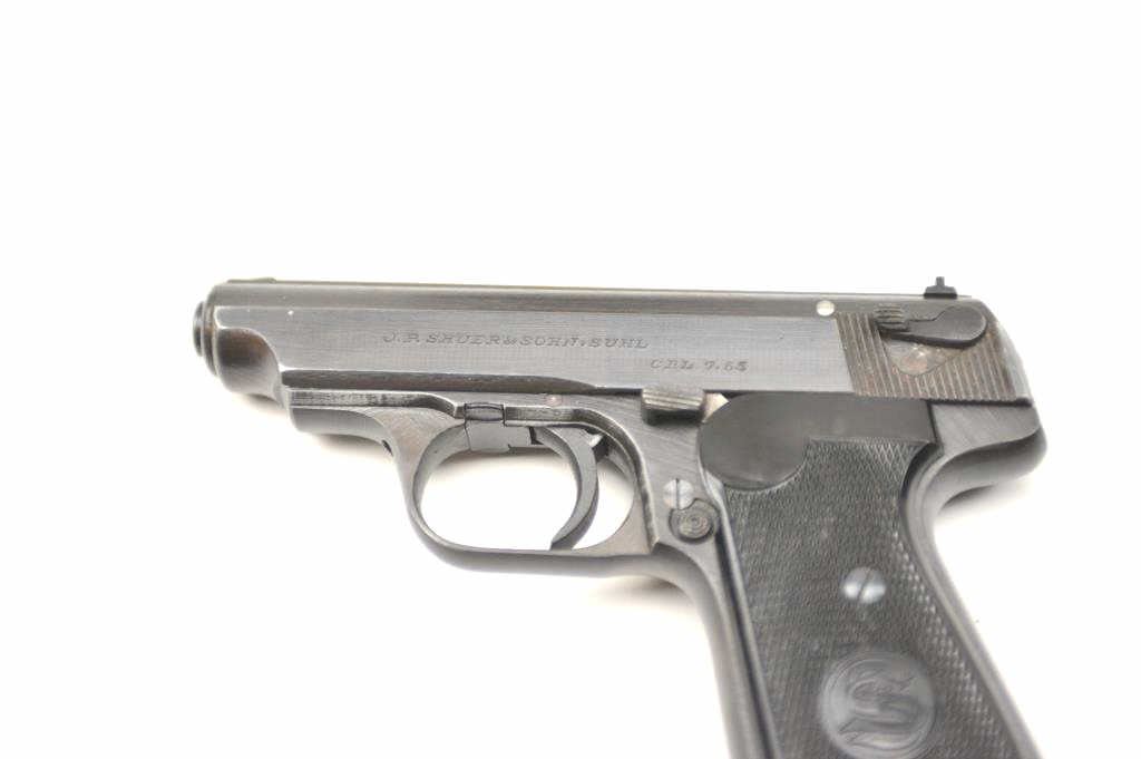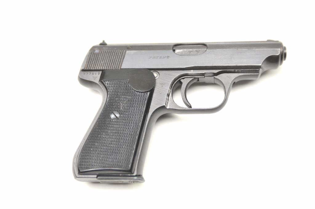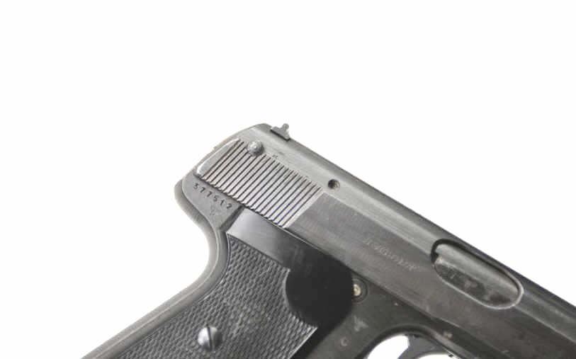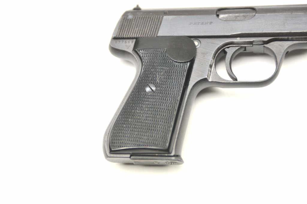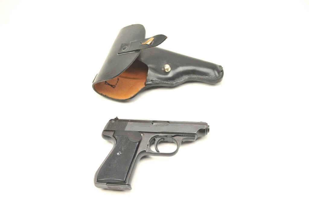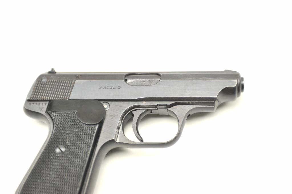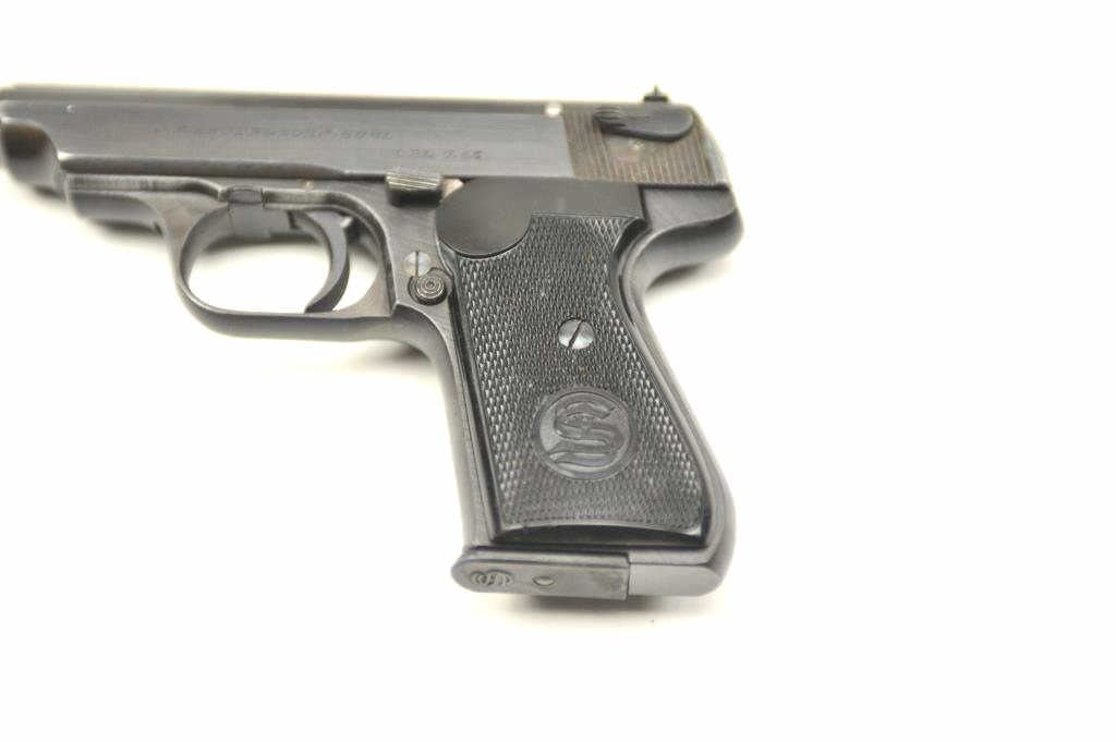 J.P. Sauer & Sohn Suhl marked Double Action Semi-Auto pistol with Nazi eagle “N” and eagle “C” proofs, S/N 377152. Black shiny leather police type holster (Unmarked). Very good plus near fine 95%+ blue with minor loss at high points and edges. Excellent composite grips. Tight mechanically and sound with bright bore showing little use. 1 original mag. (C&R/PPT) Est.: $600-$1200