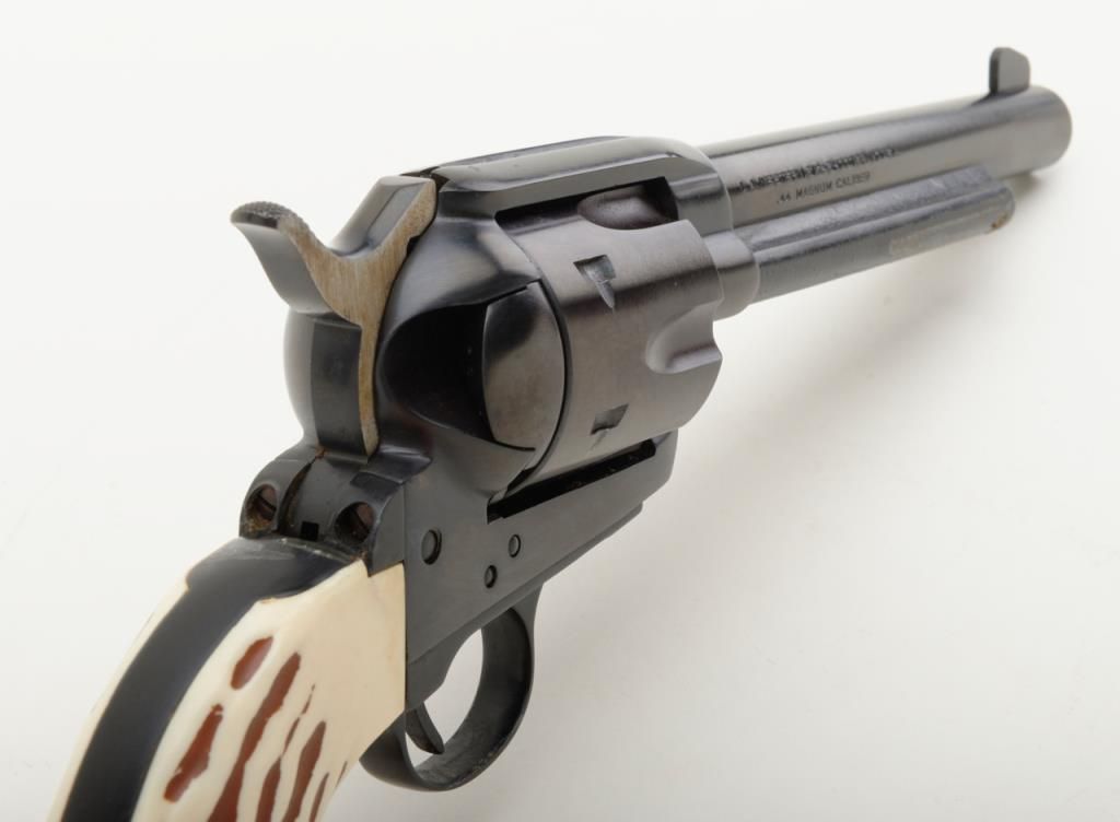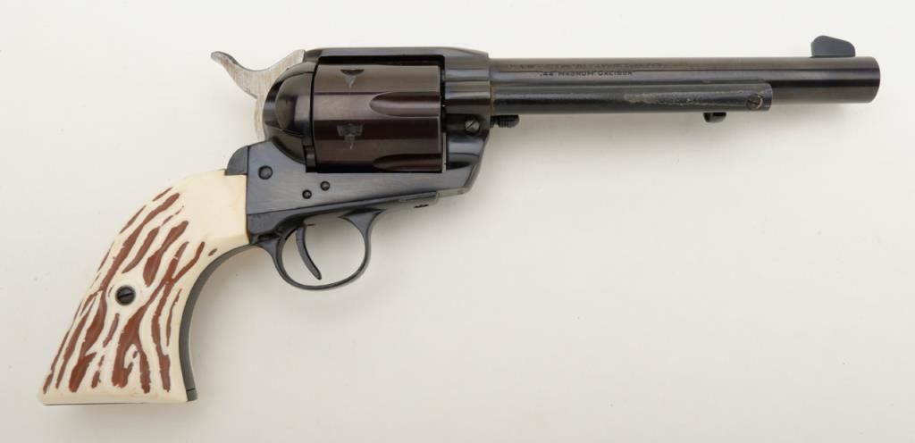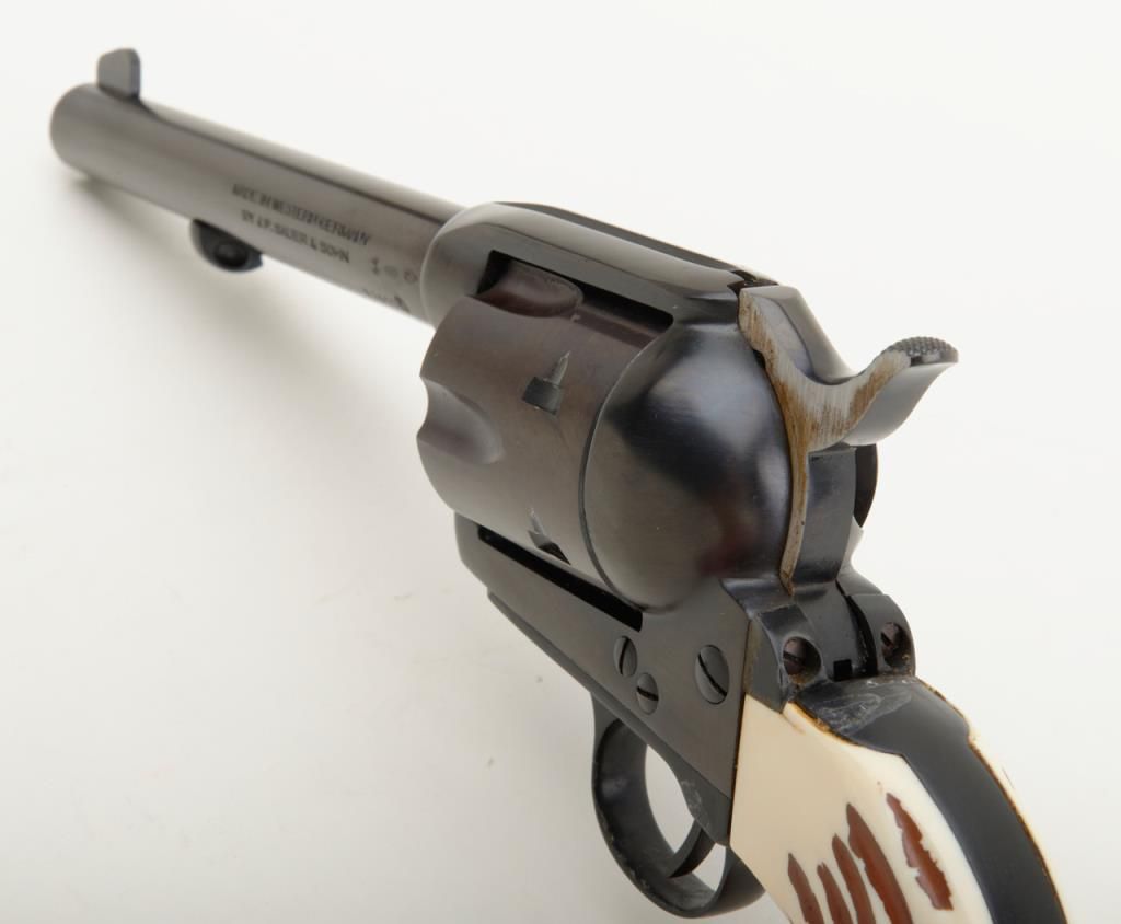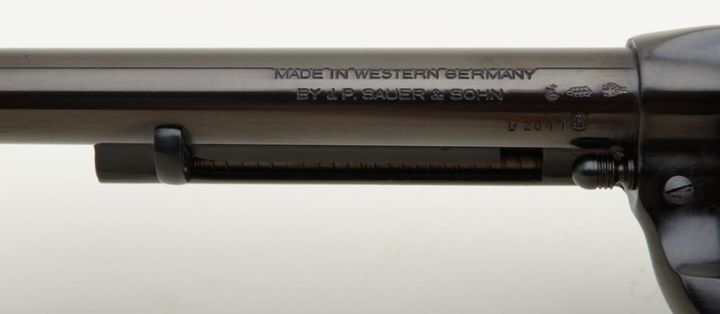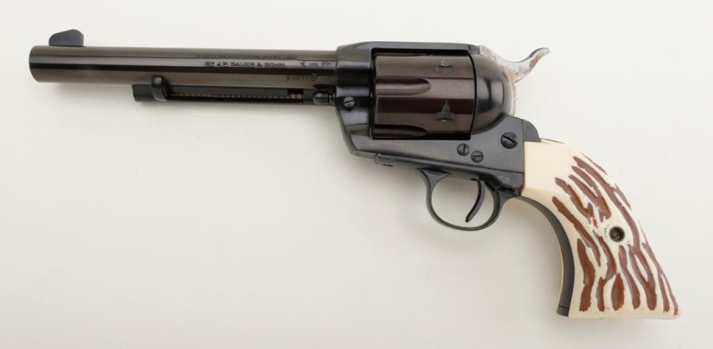J.P. Sauer & Sohn copy of a Single Action Army revolver, .44 Magnum cal., 6-1/2” barrel, blue finish, faux stag grips, #D2011 with Bucheimer leather holster; gun is in overall fine condition showing the majority of its original finish, fine bore, action, markings and grips. From an old estate. (C&R/PPT). Est.: $150-$300.