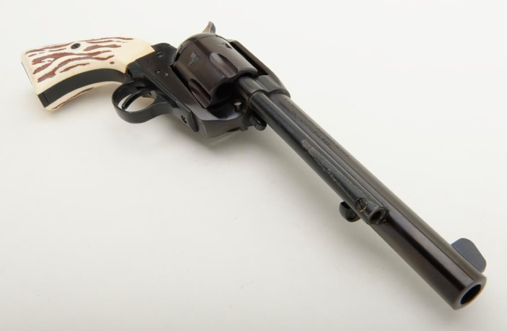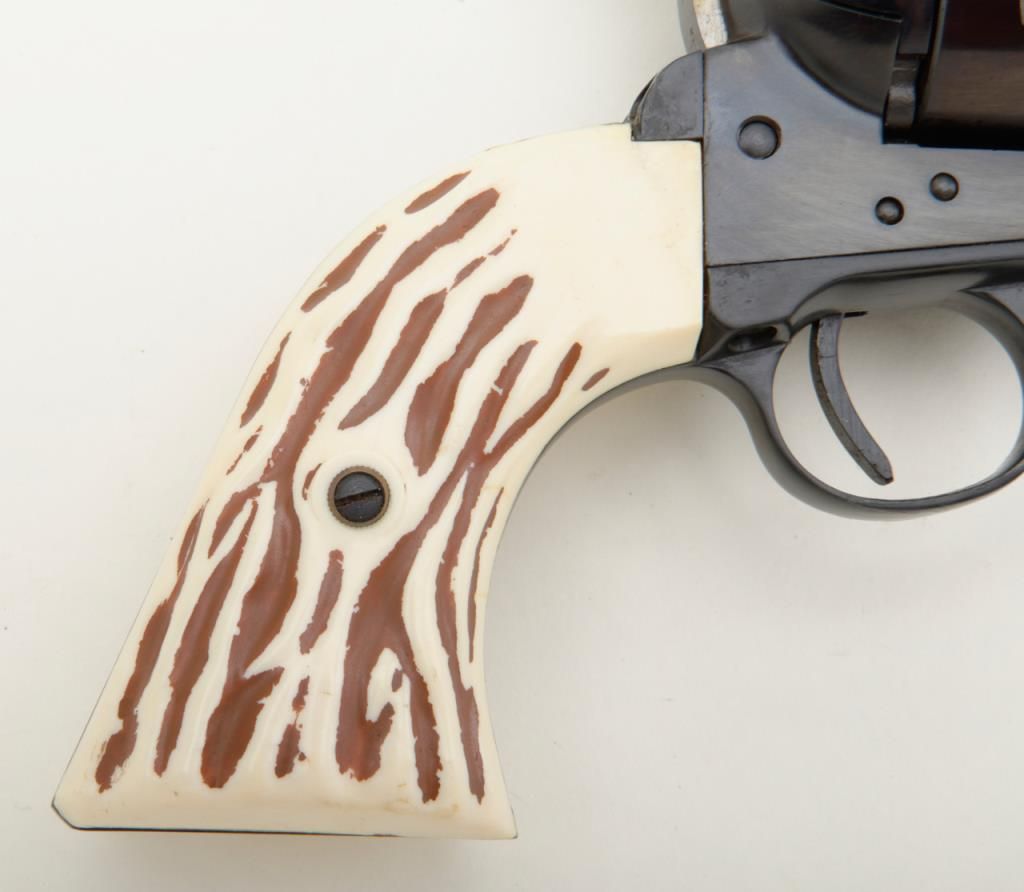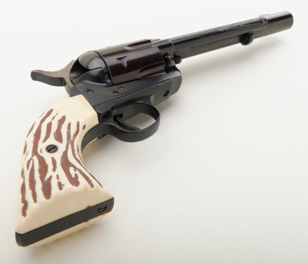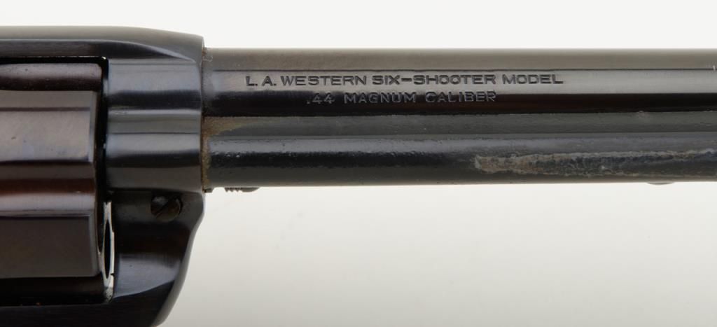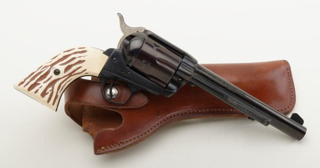 J.P. Sauer & Sohn copy of a Single Action Army revolver, .44 Magnum cal., 6-1/2” barrel, blue finish, faux stag grips, #D2011 with Bucheimer leather holster; gun is in overall fine condition showing the majority of its original finish, fine bore, action, markings and grips. From an old estate. (C&R/PPT). Est.: $150-$300.